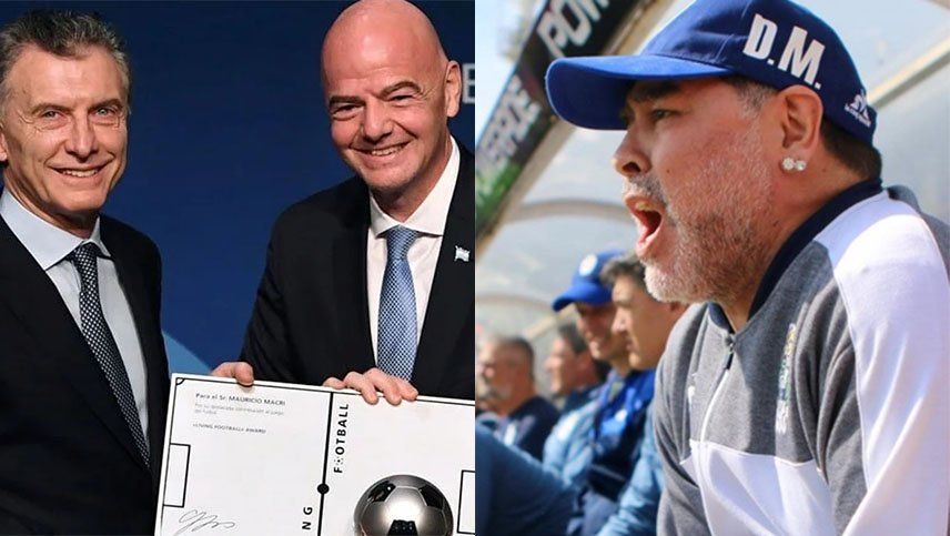 "Hablé una cosa con Infantino y me decepcionó. Veo que le dan un premio a Macri. ¿Premio a qué? Una patada en el culo hay que darle", aseveró Maradona, tras lo cual dijo: "Y volvió (Michel) Platini y volvió (Joseph) Blatter, las aguas se calmaron y se repartieron la plata entre ellos. Nadie devolvió nada, así que yo renuncio a la FIFA".