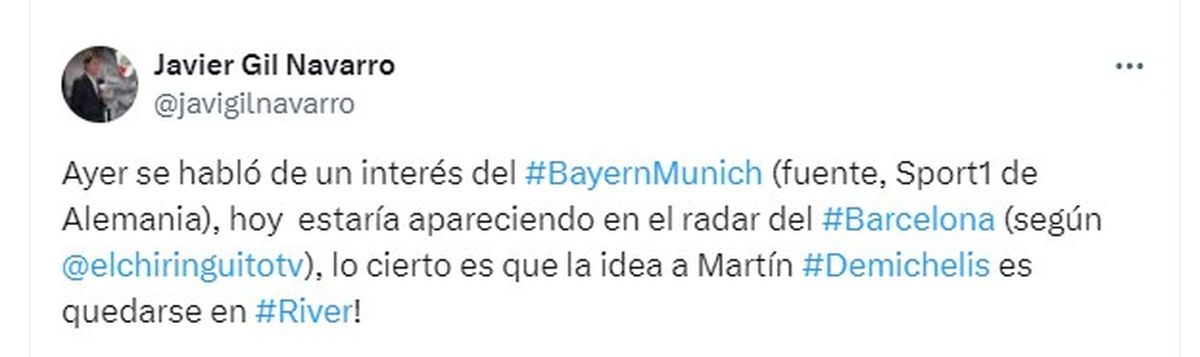 El actual director técnico del Millonario, de 43 años, llama la atención en clubes europeos, este jueves se habló del Bayern Munich y ahora es el Barça el que lo tendría en carpeta según el periodista José Álvarez Haya, de El Chiringuito TV: "Es un nombre que ha llegado a las oficinas y en el Barça se está teniendo en cuenta”.