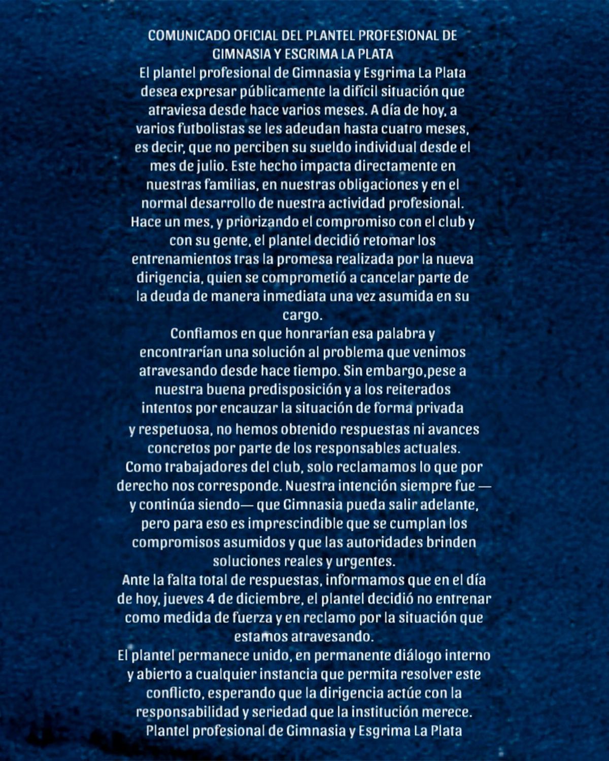 "Como trabajadores del club, solo reclamamos por lo que por derecho nos corresponde. Nuestra intención siempre fue -y continúa siendo- que Gimnasia pueda salir adelante, pero para eso es imprescindible que se cumplan los compromisos asumidos y que las autoridades brinden soluciones reales y urgentes. Ante la falta total de respuestas, informamos que en el día de hoy, jueves 4 de diciembre, el plantel decidió no entrenar como medida de fuerza y en reclamo por la situación que estamos atravesando".