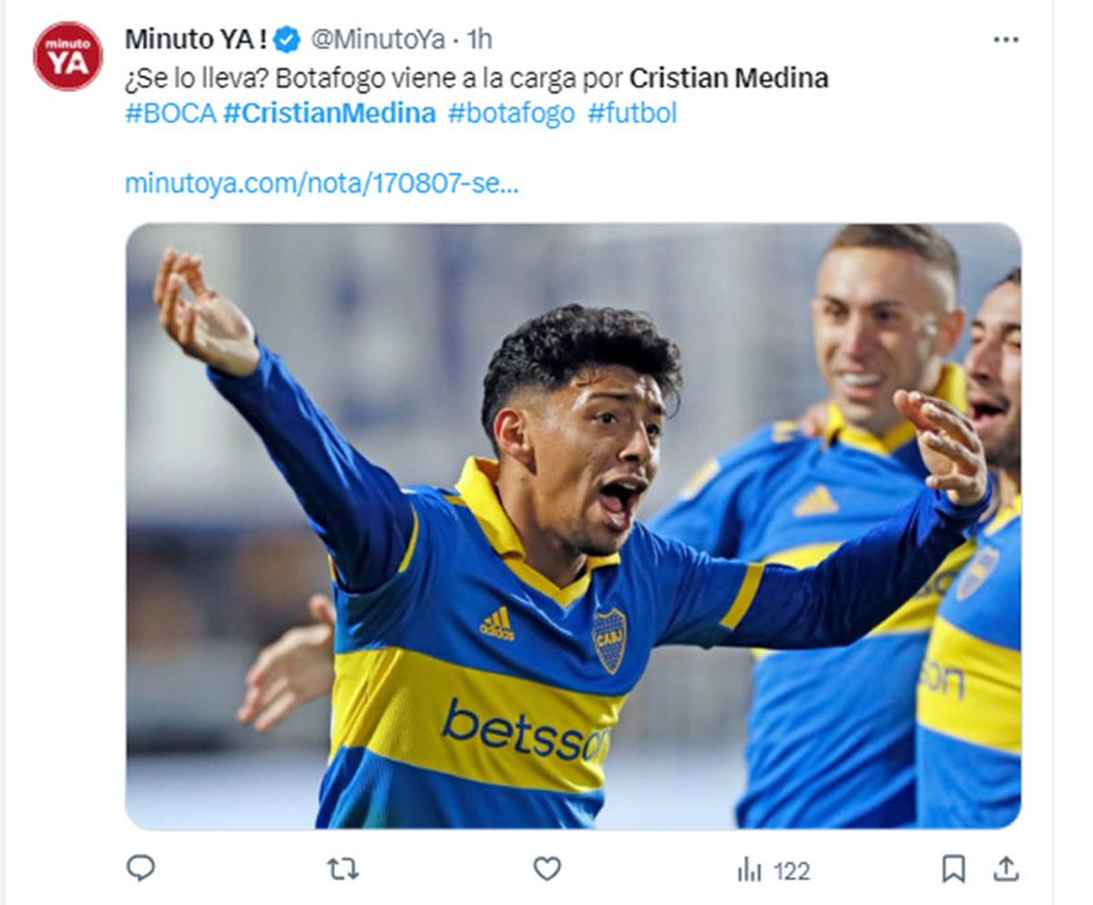 "Es visto como una pieza clave para llegar y ser titular", indicó el medio deportivo brasileño, que precisó el origen de un futuro derrotero de Medina hasta Inglaterra al señalar que Botafogo pertenece a Eagle Football, una empresa propietaria también de Olympique Lyon, de Francia, donde juega el argentino Nicolás Tagliafico, y justamente el Crystal Palace, de Londres.