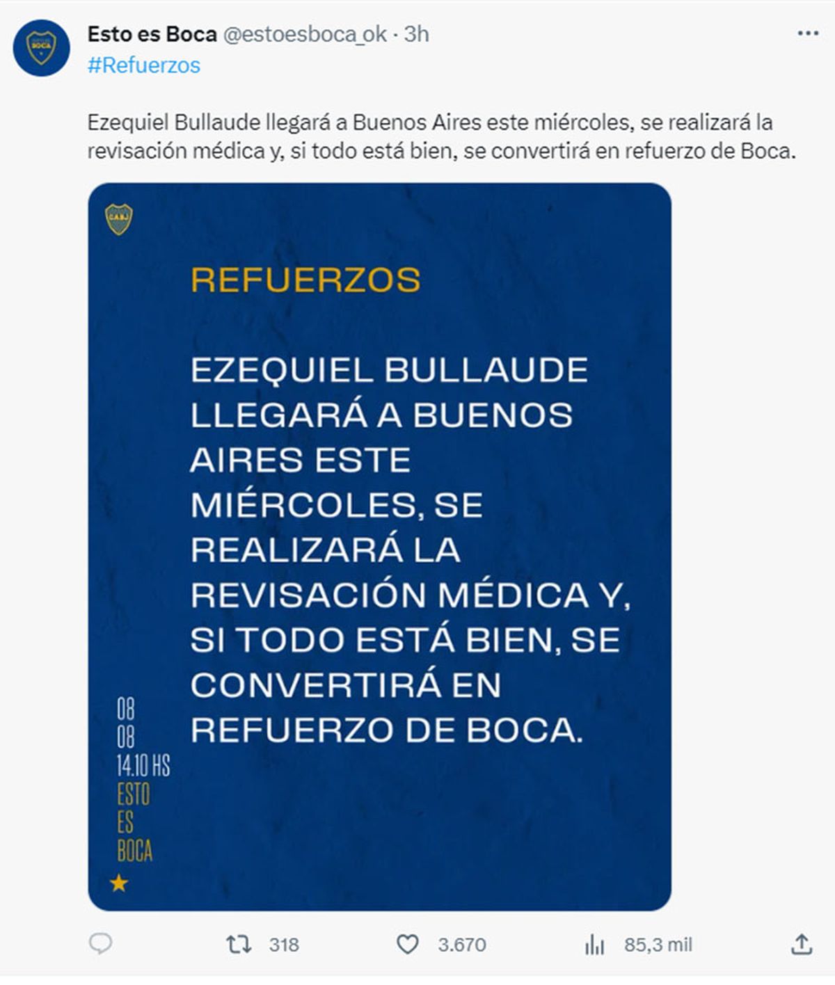 “Ezequiel Bullaude llegará a Buenos Aires este miércoles, se realizará la revisión médica y, si todo está bien, se convertirá en refuerzo de Boca”, fue el comunicado oficial de la nueva cuenta de Boca (@estoesboca) que se encarga de informar sobre el mercado de pases xeneize, entre otros temas de difusión.