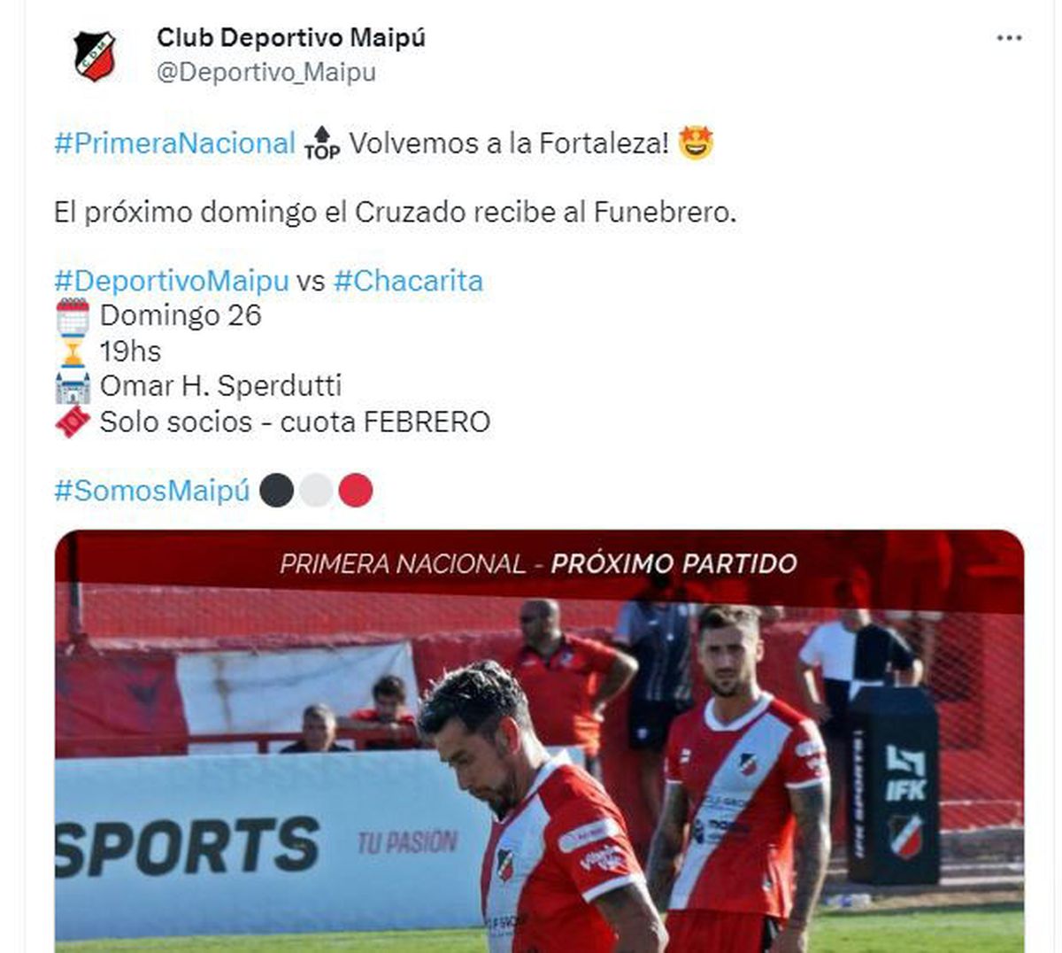 Se espera una buena convocatoria para este domingo para ver al Deportivo Maipú. En los dos primeros partidos el Cruzado ha mostrado una buena propuesta de fútbol y ahora buscará ratificarlo, para dejar atrás la caída ante Mitre, que fue injusta.