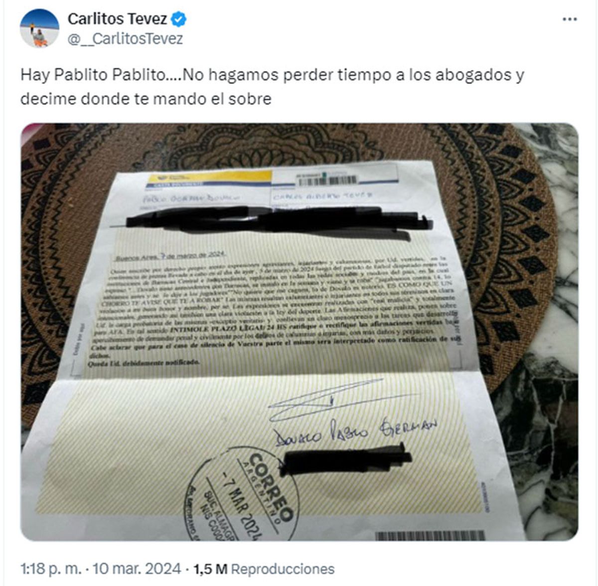 La carta documento se debe a "expresiones agraviantes, injuriantes y calumniosas", e intima a Tevez para que ratifique o rectifique en 24 horas sus afirmaciones.