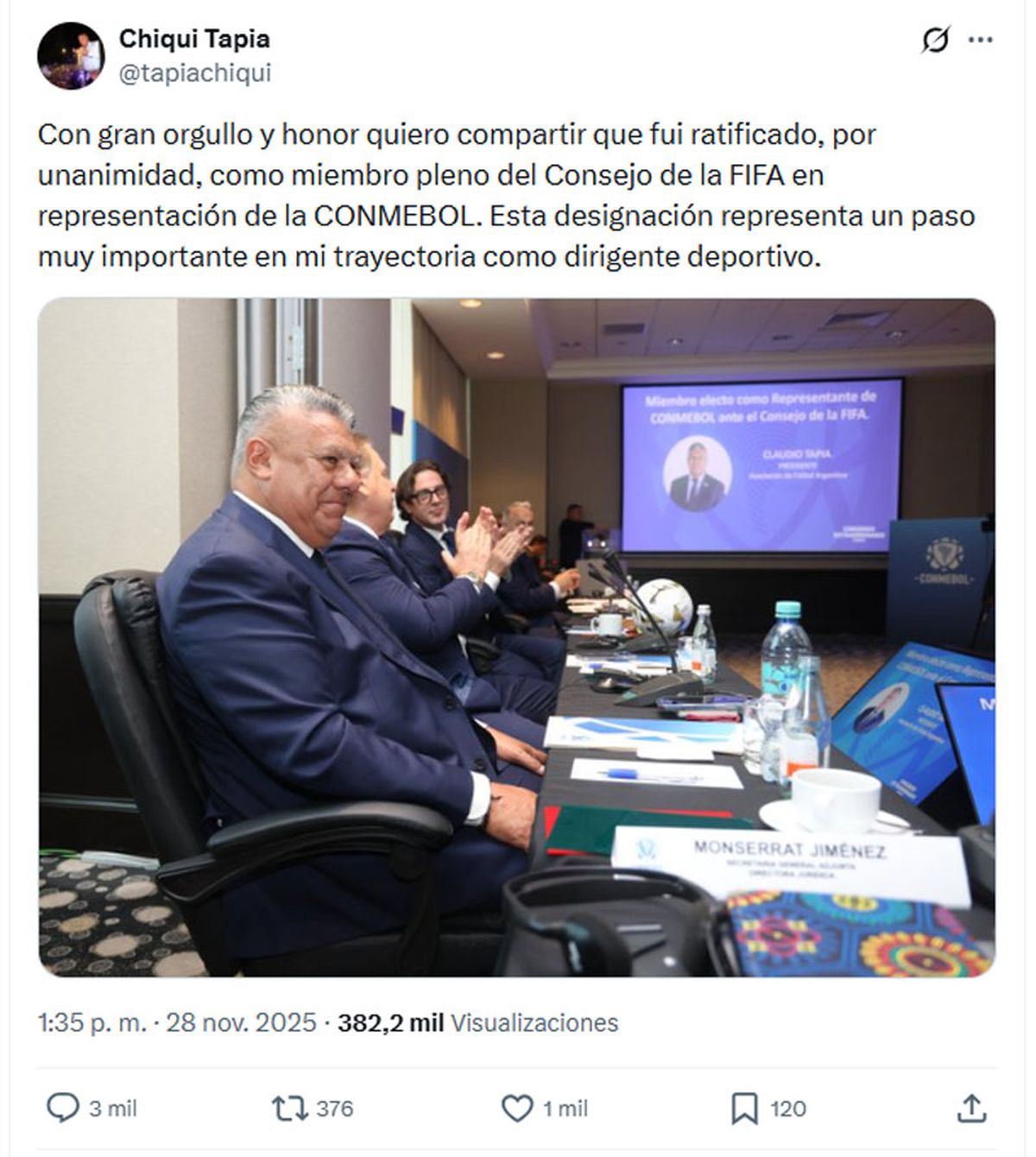 "Con gran orgullo y honor quiero compartir que fui ratificado, por unanimidad, como miembro pleno del Consejo de la FIFA en representación de la CONMEBOL", dijo Tapia en sus redes sociales. Además, calificó la designación como "un paso muy importante" en su trayectoria como dirigente deportivo.
