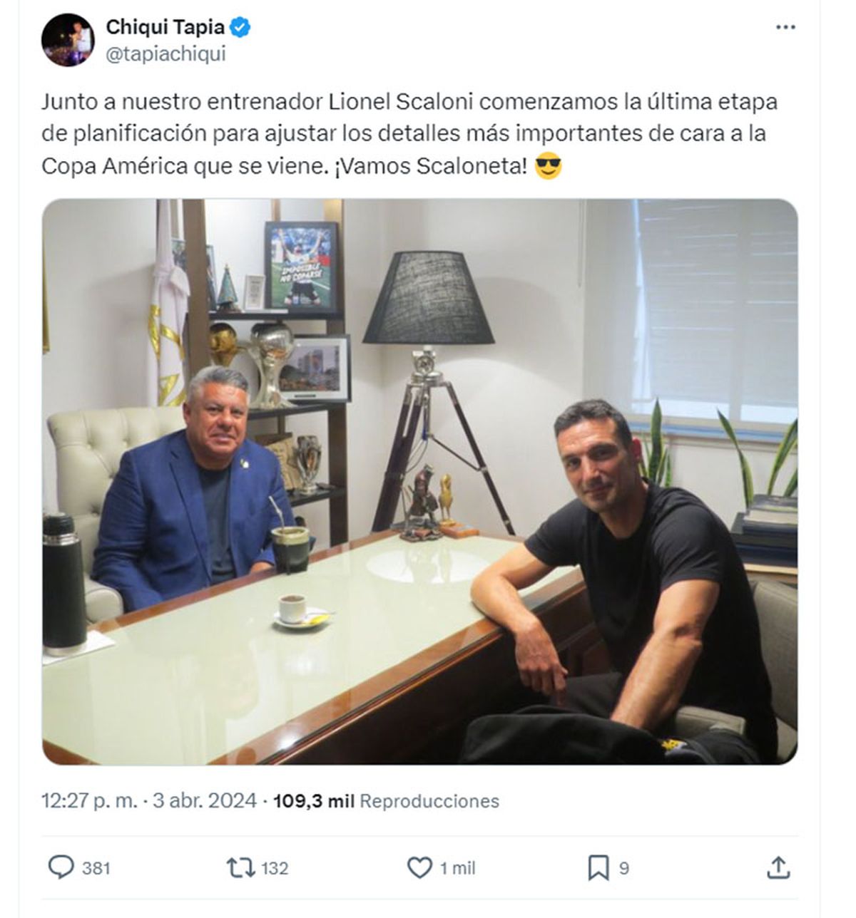 "Junto a nuestro entrenador Lionel Scaloni comenzamos la última etapa de planificación para ajustar los detalles más importantes de cara a la Copa América que se viene. ¡Vamos Scaloneta! ", dijo Tapia en sus redes. sociales.