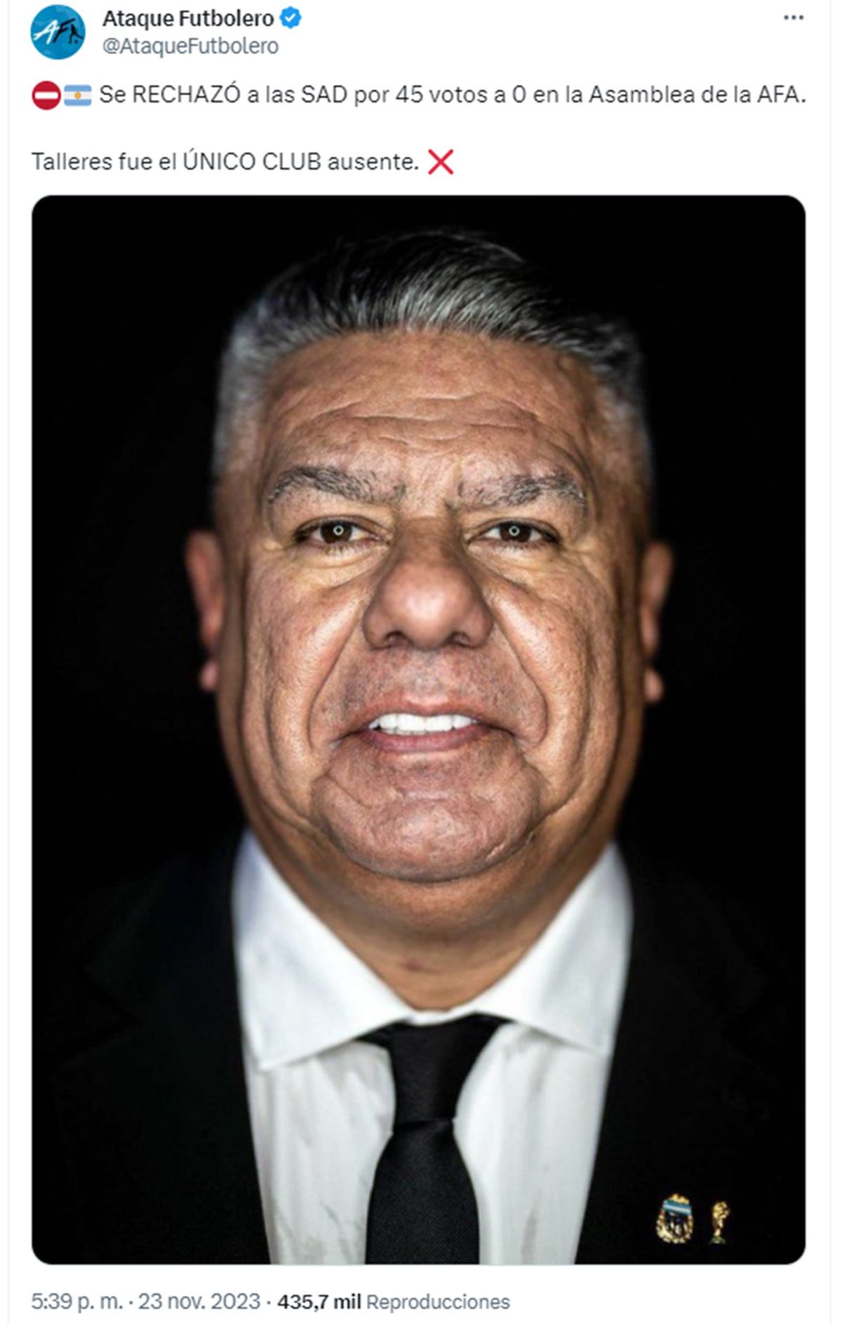 Claudio Chiqui Tapia, presidente de la Asociación del Fútbol Argentino ( AFA), le mandó un duro mensaje a Mauricio Macri, impulsor referente de la figura de las Sociedades Anónimas Deportivas (SAD) en el fútbol, en la Asamblea General Ordinaria que encabezó durante la tarde de este jueves en el estadio de Futsal del Predio Lionel Andrés Messi ubicado en la localidad de Ezeiza.