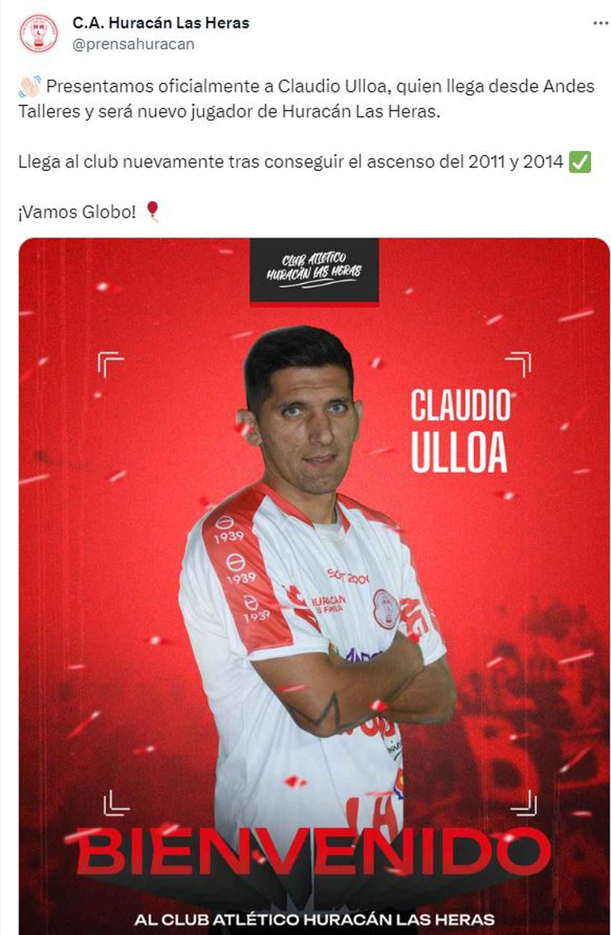 Claudio Ulloa viene de jugar en Andes Talleres e iniciará su tercera etapa en la institución de calle Olascoaga: "Estoy muy feliz de volver al club. Todos saben el sentimiento que tengo por estos colores. Estoy con muchas ganas de poder jugar y extrañaba mucho todo lo que se vive en esta institución".
