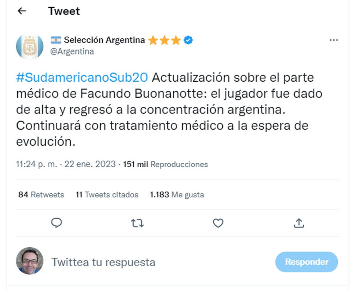 Ayer, la entidad había utilizado la misma plataforma para informar que Buonanotte había sufrido "traumatismo de columna cervical y cráneo durante el partido ante Paraguay", y que el futbolista se encontraba "en buen estado" a la espera de los estudios correspondiente.