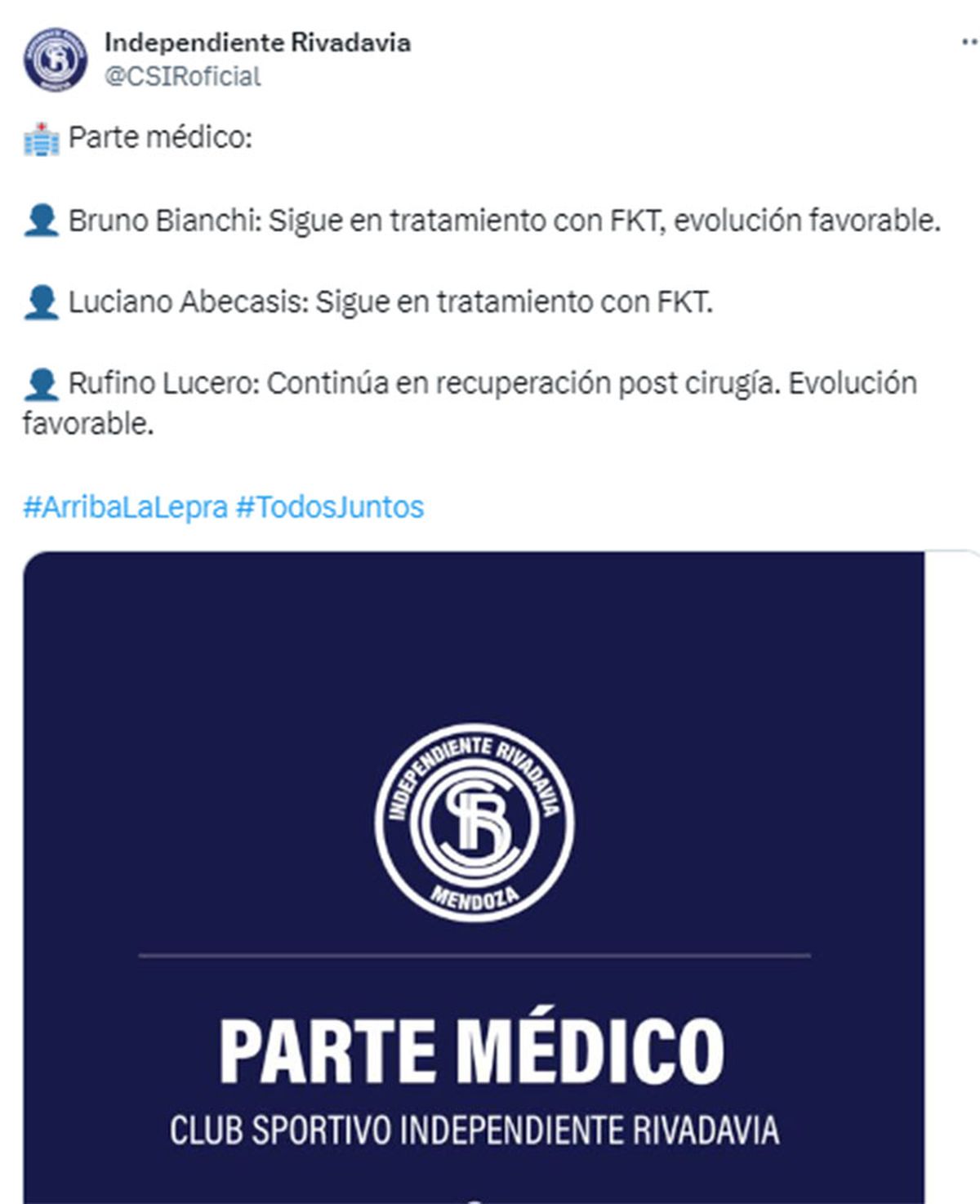 Independiente Rivadavia dio a conocer este jueves el parte médico de los jugadores lesionados. La Lepra se medirá el próximo sábado a las 18 con Huracán, en Parque de los Patricios, por la quinta fecha de la Liga Profesional de Fútbol.