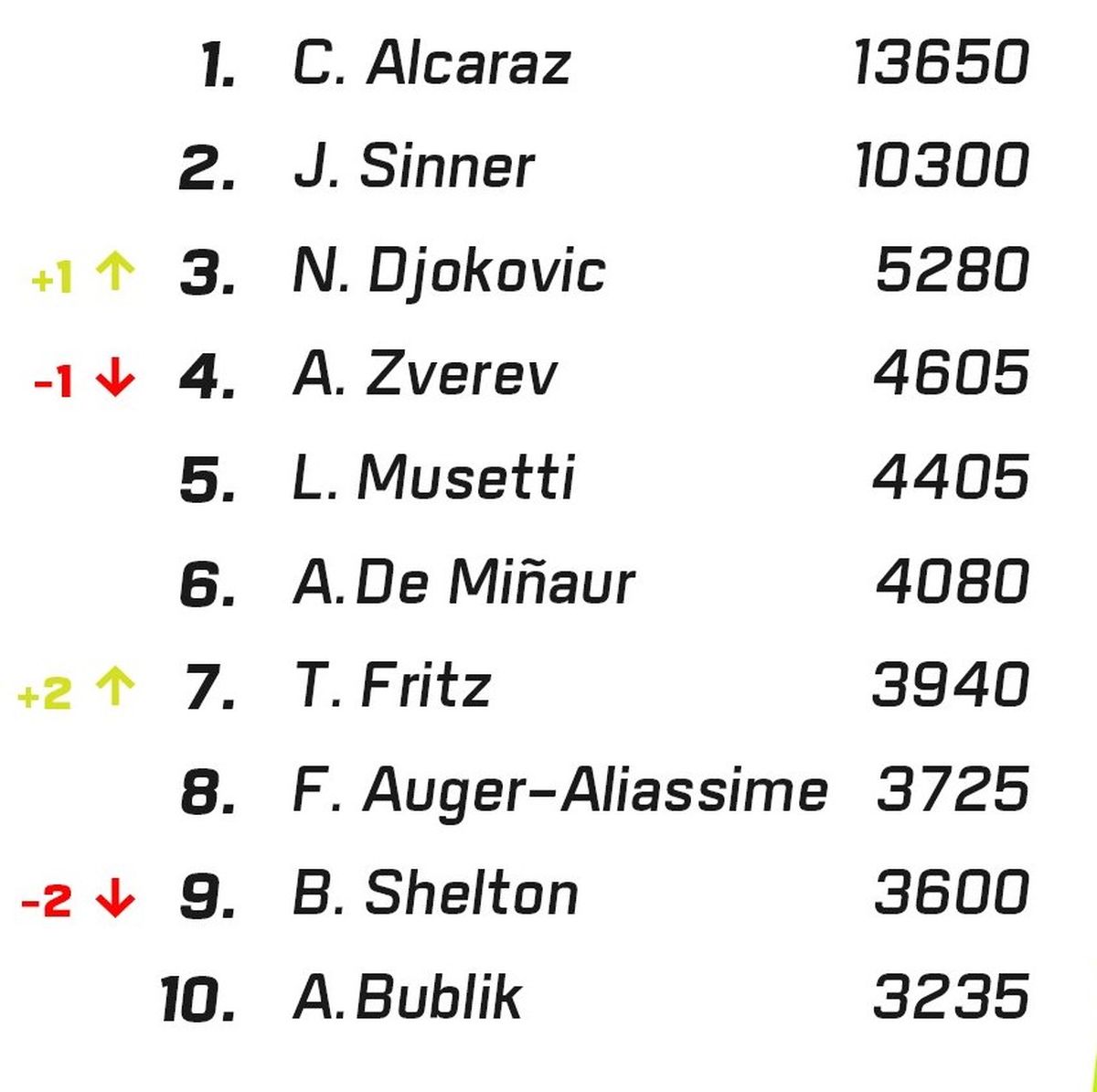 Lorenzo Musetti quedó ubicado en la quinta posición, Alex de Miñaur en la sexta, y quien subió a la séptima ubicación fue el estadounidense Taylor Fritz. En el octavo puesto del ranking ATP quedó el candiense Félix Auger-Aliassime y al noveno puesot cayó Ben Shelton. El top ten lo completa Aleksandr Bublik, verdugo de Etcheverry en el Abierto de Australia.