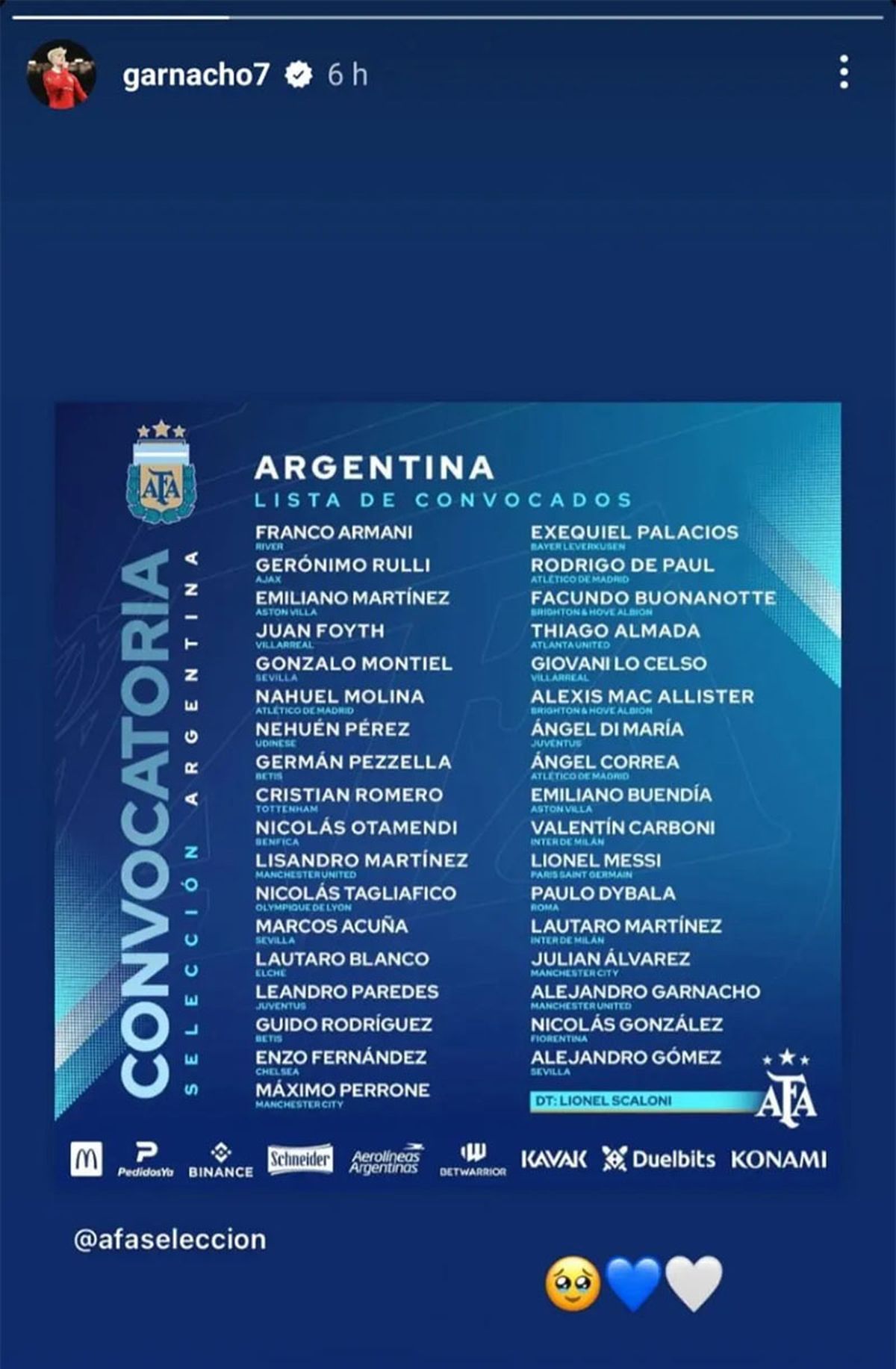 Al ser notificado de esta situación, el número 49 de los "Red Devils" compartió -en su historia de Instagram- la lista de convocados por parte de la cuenta oficial del equipo argentino @afaseleccion y acompañó la publicación con corazones celestes y blancos junto a un emoji emocionado, mostrando así, su alegría por la citación.