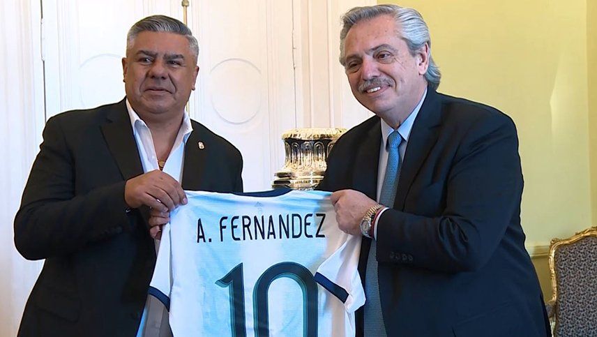 Domínguez le obsequió a Fernández una réplica de la Copa América y Tapia le regaló una camiseta de la Selección con la número 10 y su nombre estampado.