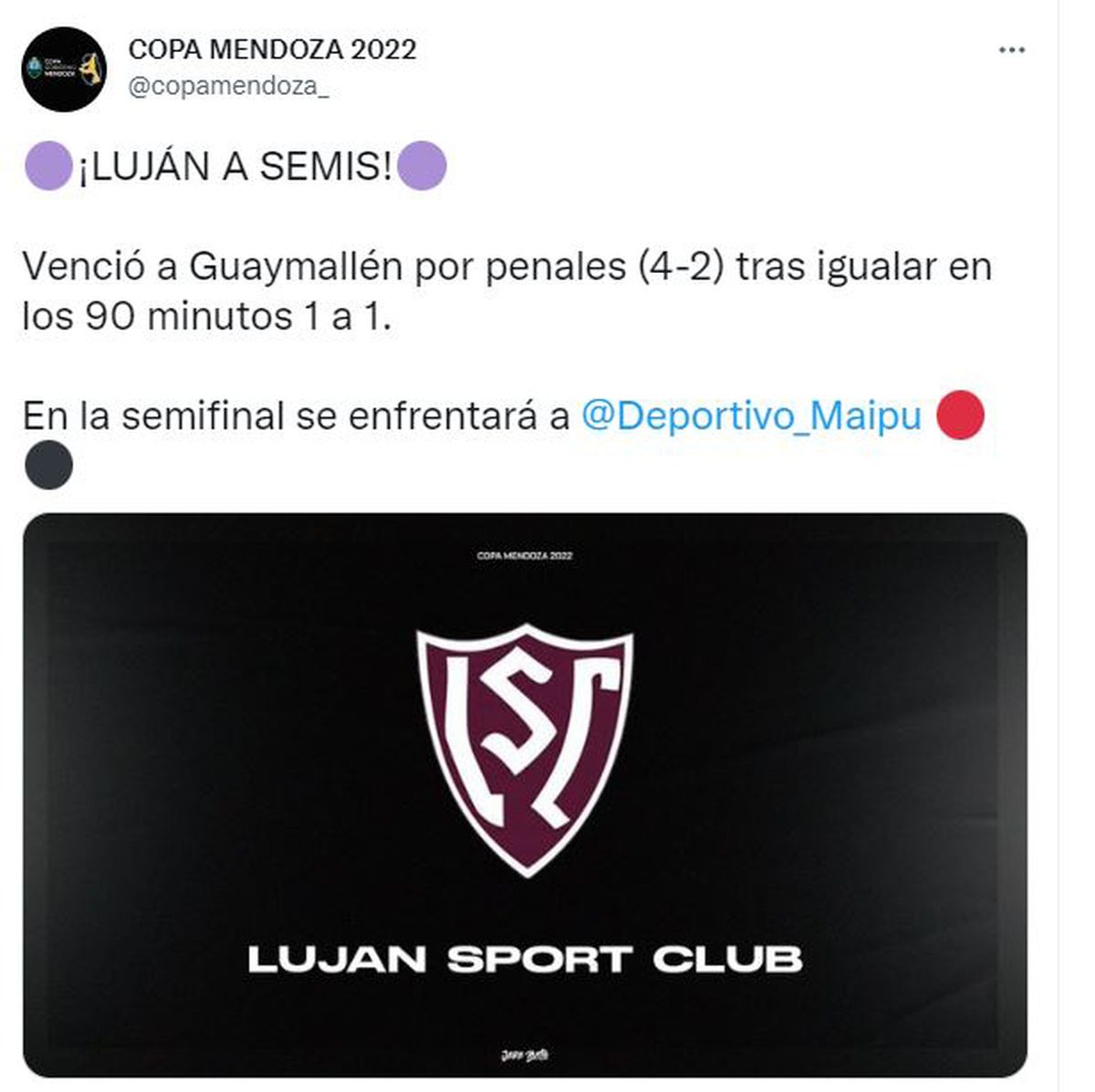 Luján Sport Club se impuso por penales 4 a 2 ante Deportivo Guaymallén, luego de empatar 1 a 1 en los noventa minutos reglamentarios, y se metió en las semifinales de la Copa Mendoza. El partido se disputó este jueves por la noche en el estadio Malvinas Argentinas. El Granate ahora enfrentará al Deportivo Maipú, donde buscará un lugar en la final del certamen.