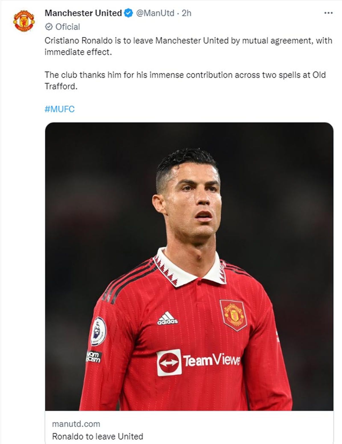 "Cristiano Ronaldo dejará el Manchester United de mutuo acuerdo, con efecto inmediato. El club le agradece su inmensa contribución durante dos etapas en Old Trafford, anotando 145 goles en 346 apariciones, y le desea a él y a su familia lo mejor para el futuro", fue el mensaje del club en su página oficial.