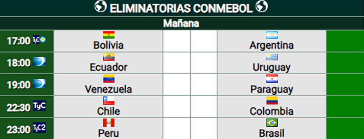 El primero en abrir la fecha será la visita de la Selección argentina a Bolivia, que se jugará a partir de las 17 en la altura de la ciudad de La Paz, luego del triunfo del conjunto albiceleste por 1 a 0 sobre Ecuador y de la derrota aplastante por 5 a 1 del conjunto de Gustavo Costas frente a Brasil.