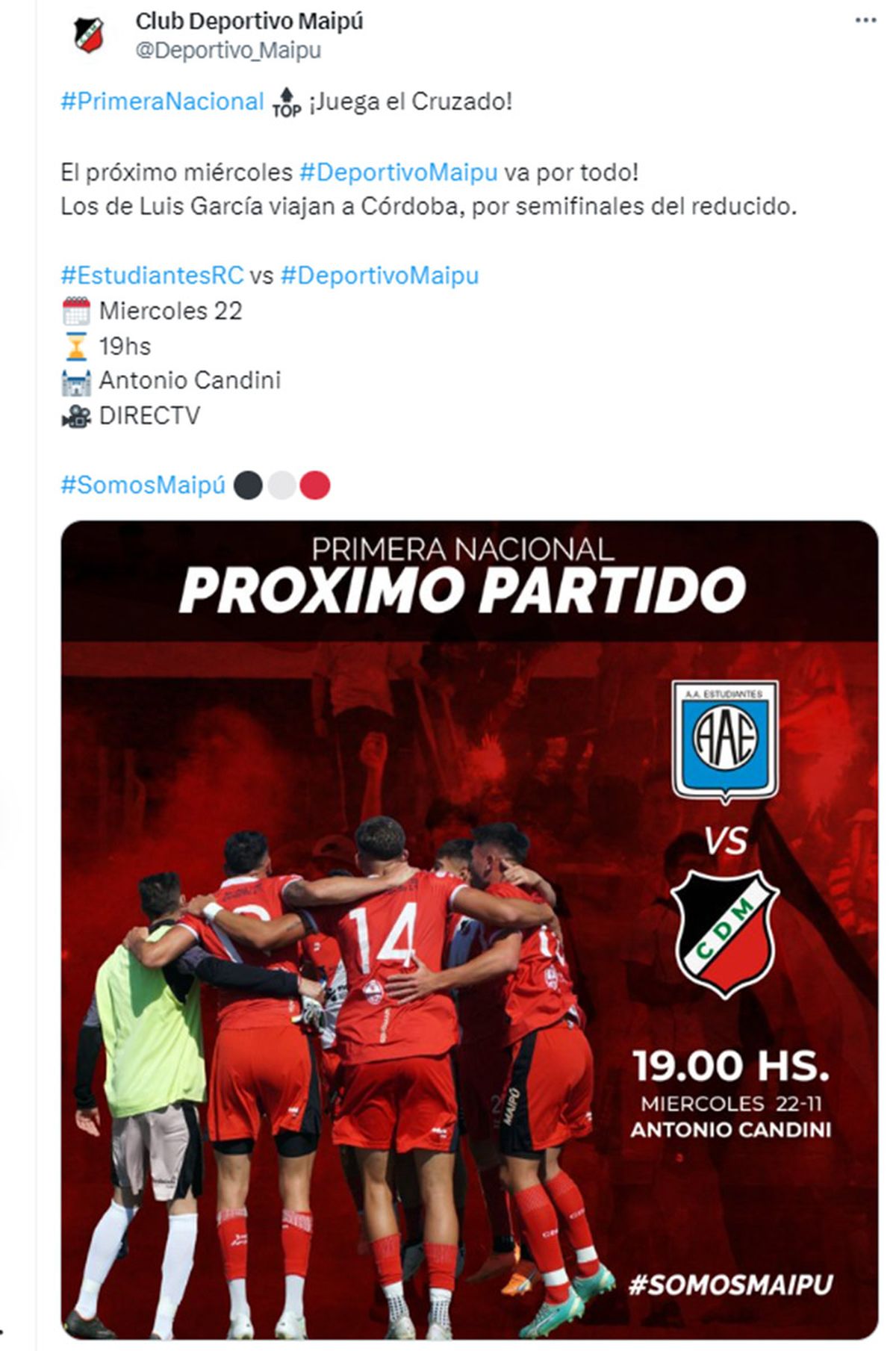 El partido se disputará el próximo miércoles 22 de noviembre a las 19, en el estadio Cantoni, de esa provincia y será televisado por DirecTV. Así lo confirmó la entidad maipucina en su cuenta de Twitter.