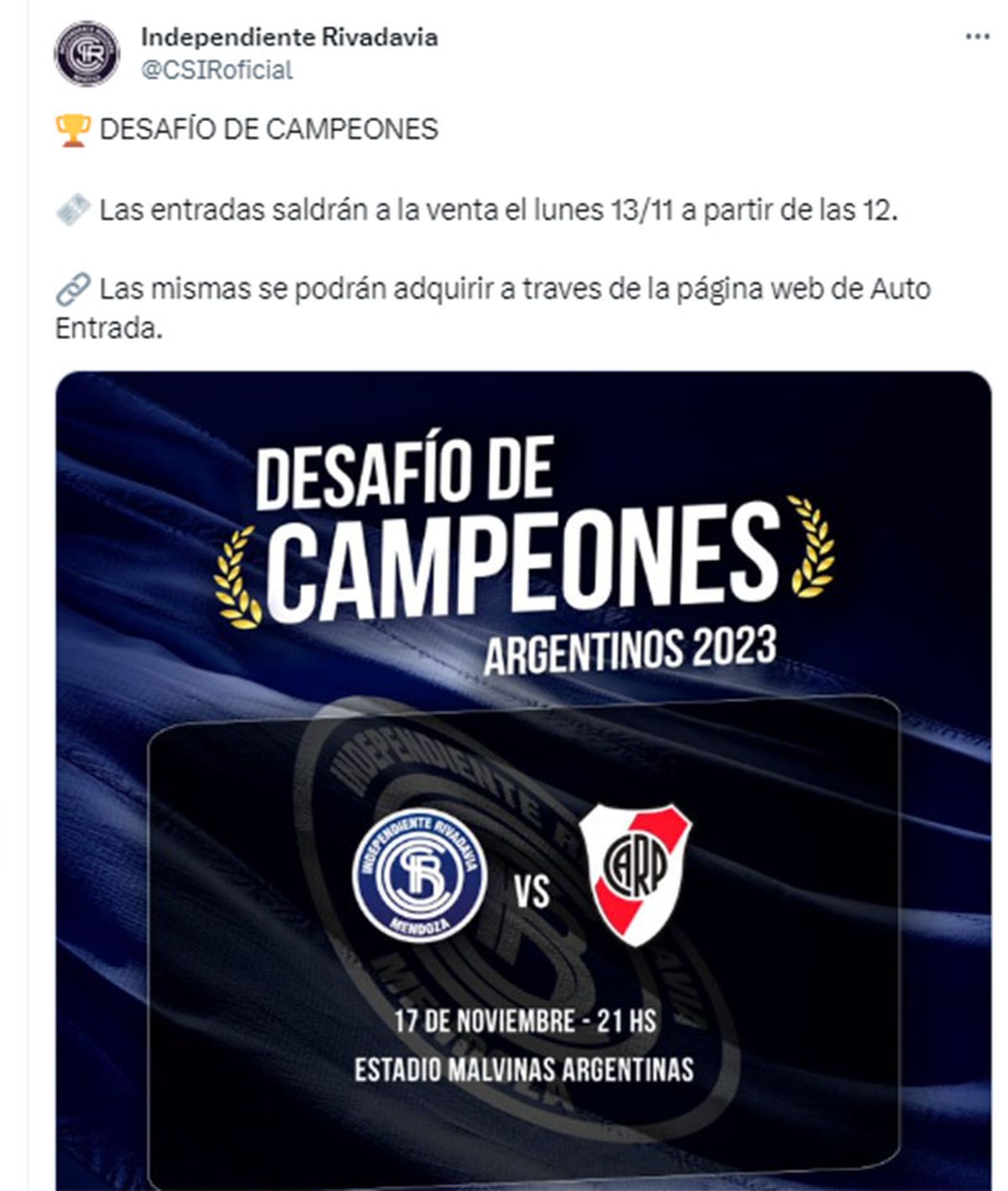 Independiente Rivadavia festejará su ascenso a Primera División con un partido amistoso ante River, último campeón de la Liga Profesional. Se jugará el Desafío de Campeones Argentinos 2023.