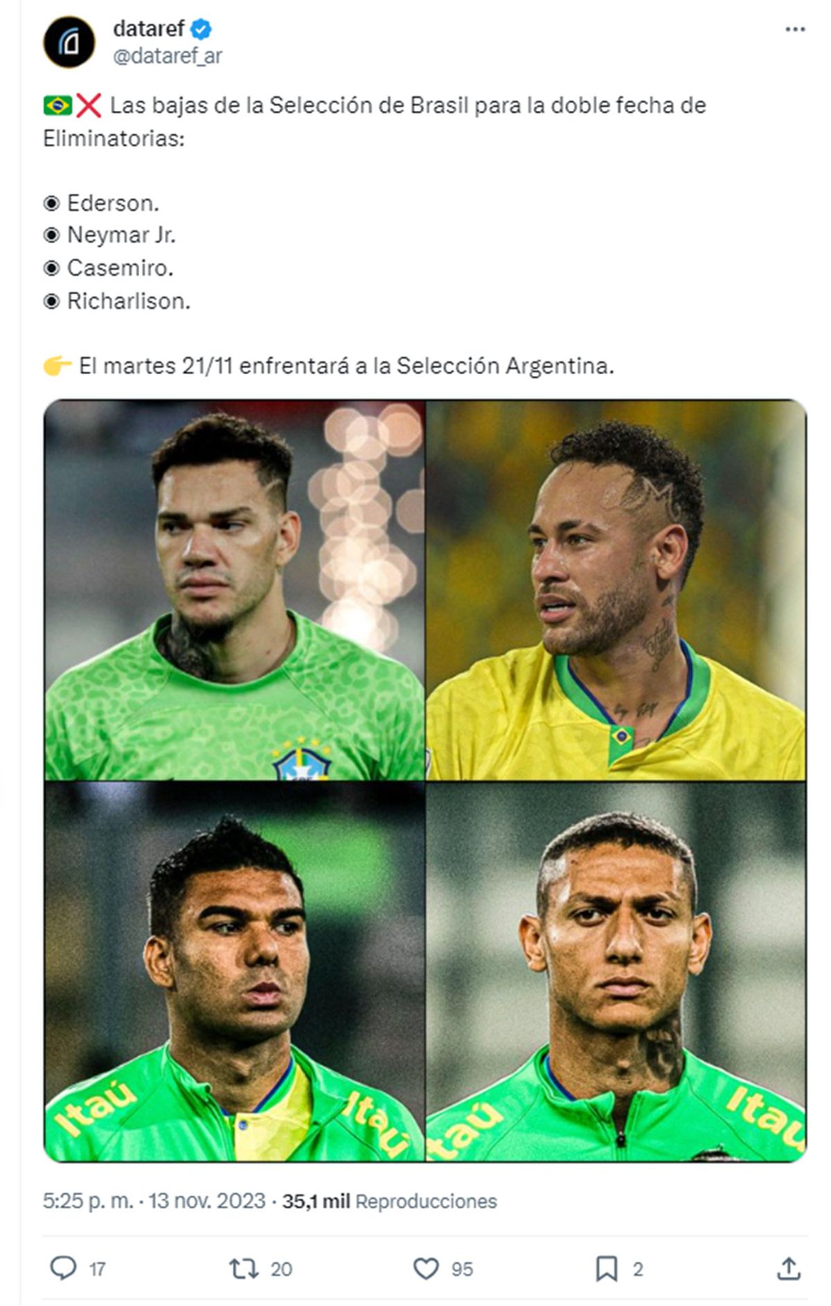 El martes 21 de noviembre desde las 21.30, Brasil recibirá a Argentina.