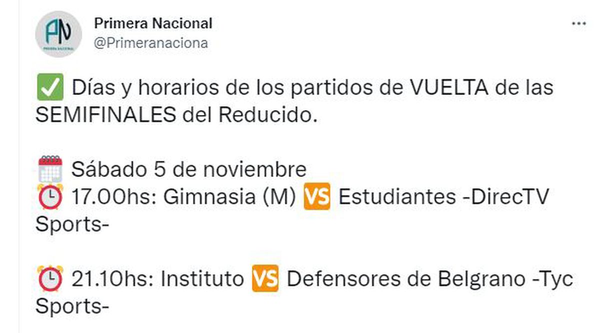 Si bien falta la confirmación de la Asociación de Fútbol Argentino (AFA), las finales del Reducido de la Primera Nacional en busca del segundo ascenso serían el 12 y 19 de noviembre.