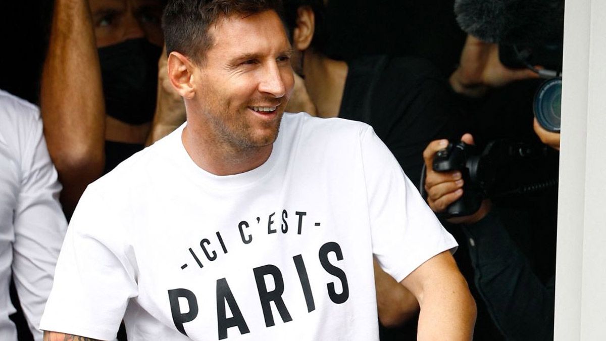 Apenas aterrizó en el aeropuerto de París- Le Bourget, Messi se puso una remera que decía 'Ici, c'est Paris' (Esto es París) y unos minutos después salió a saludar a los fanáticos desde una ventana.