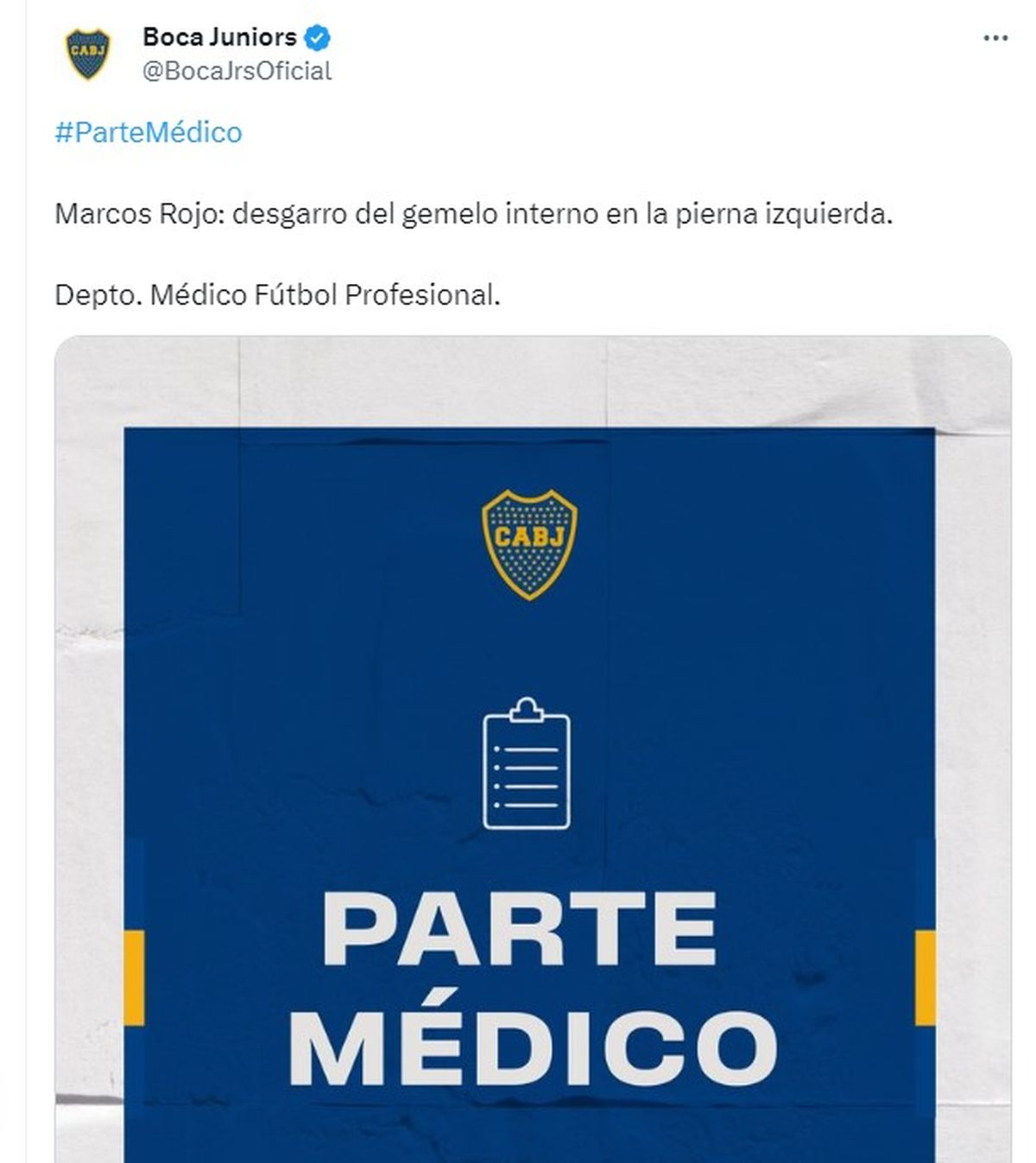 El parte médico oficial de Boca indicó hoy que "Rojo sufrió un desgarro en el gemelo interno de la pierna izquierda".