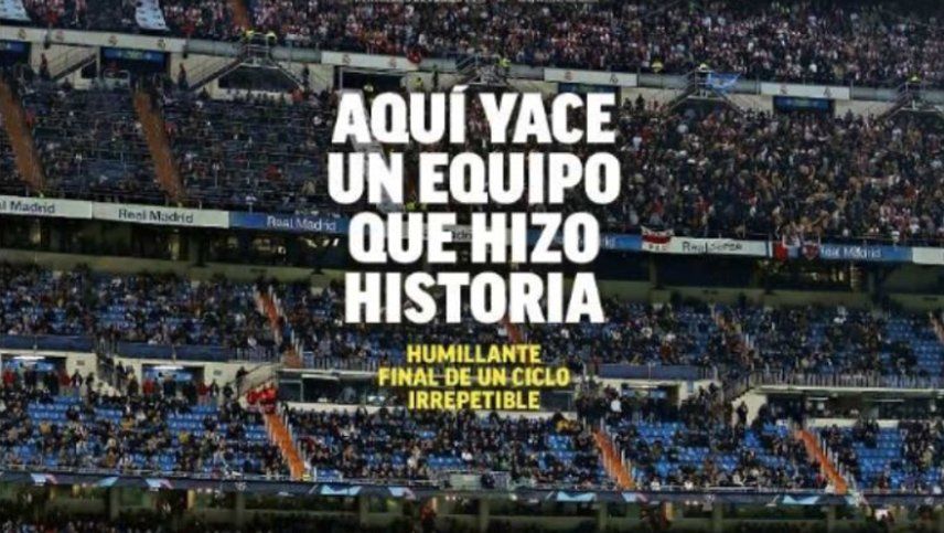 "Aquí yace un equipo que hizo historia", titula en portada, sobre una foto del Santiago Bernabéu medio vacío, el diario Marca, que en subtítulo insiste "humillante final de un ciclo irrepetible".