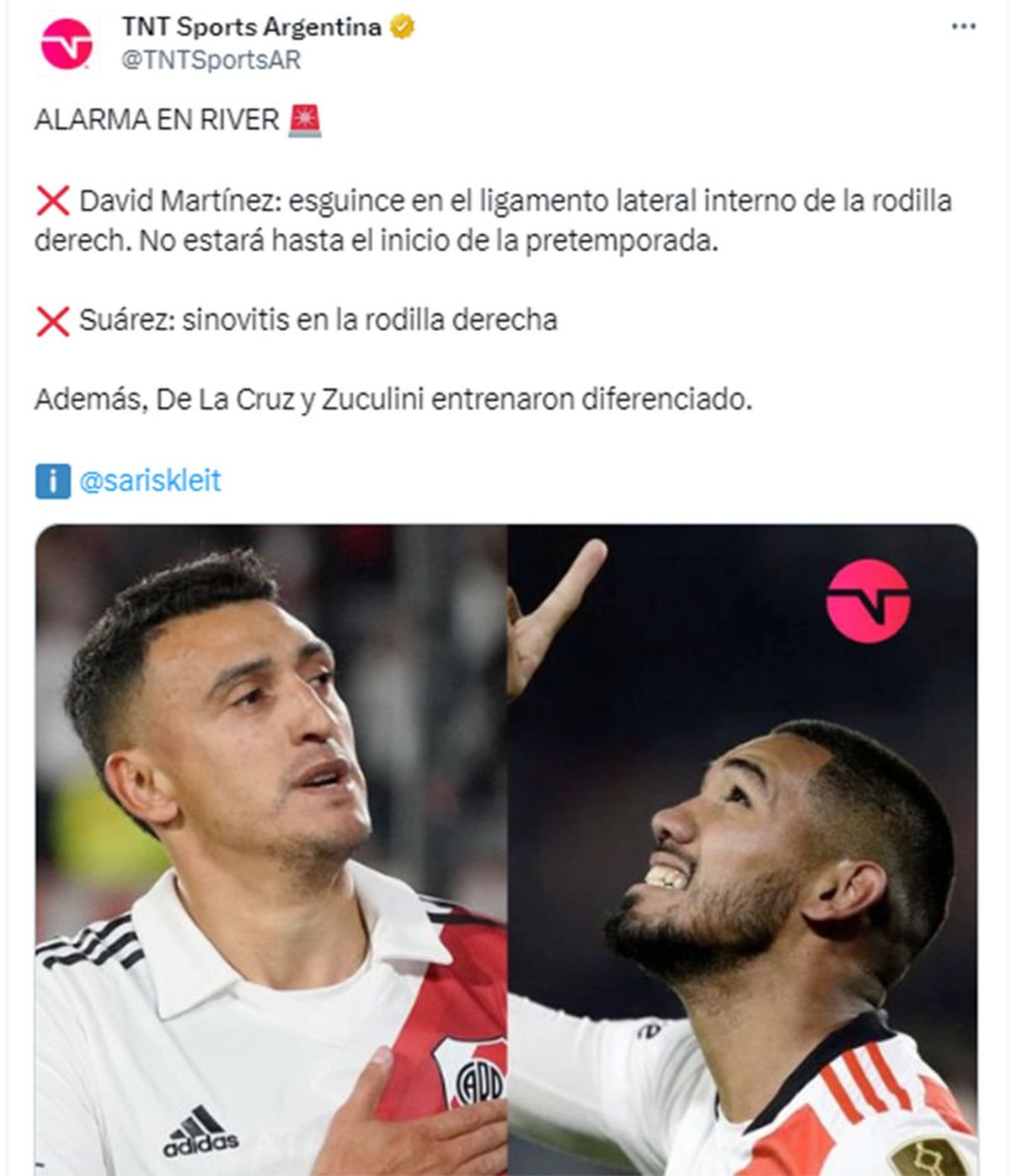 Por su parte, Suárez volvió a tener molestias por una sinovitis en la rodilla derecha y se perdería la convocatoria del que puede ser su último partido en River, ya que el 31 de diciembre se le termina el contrato.