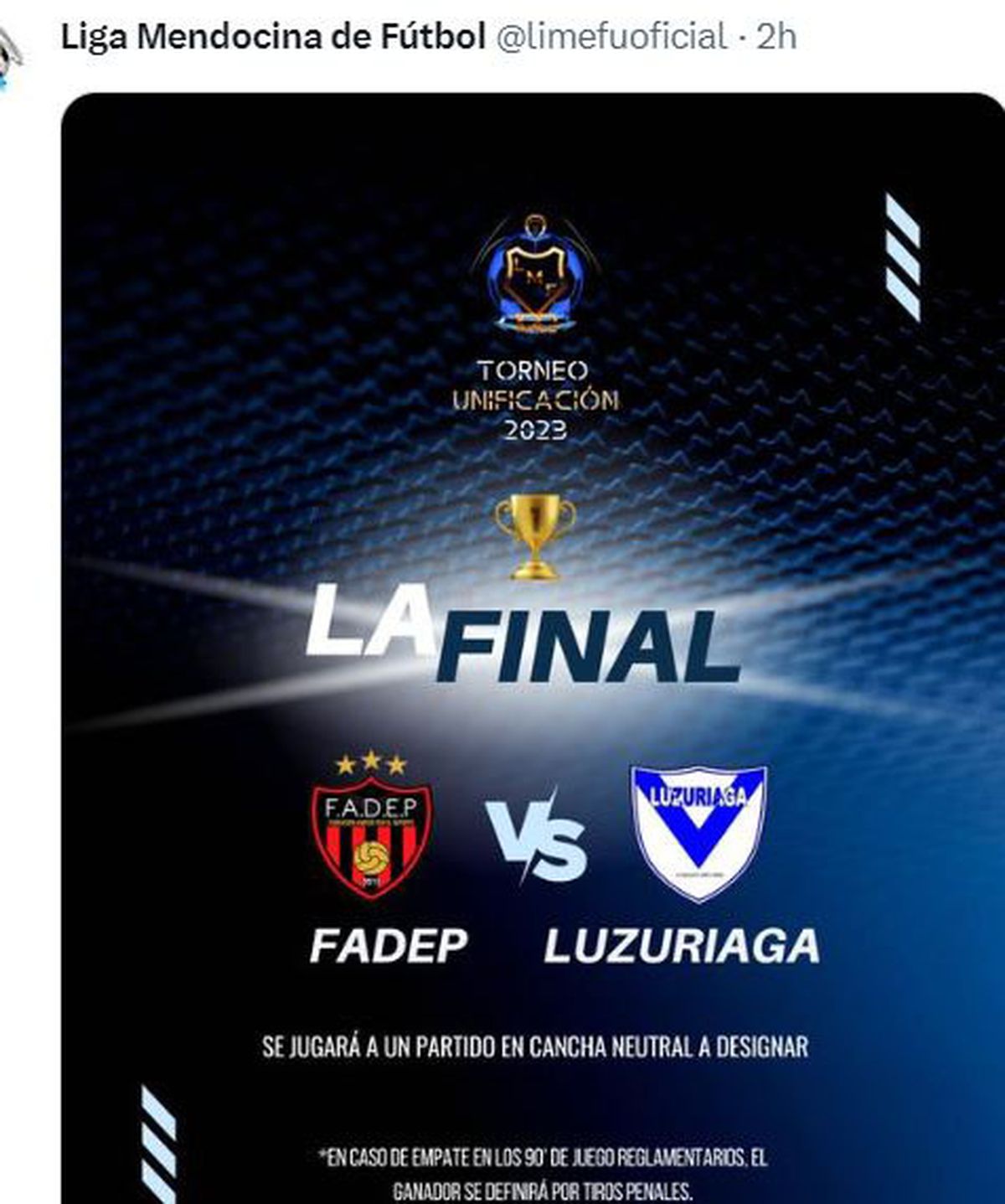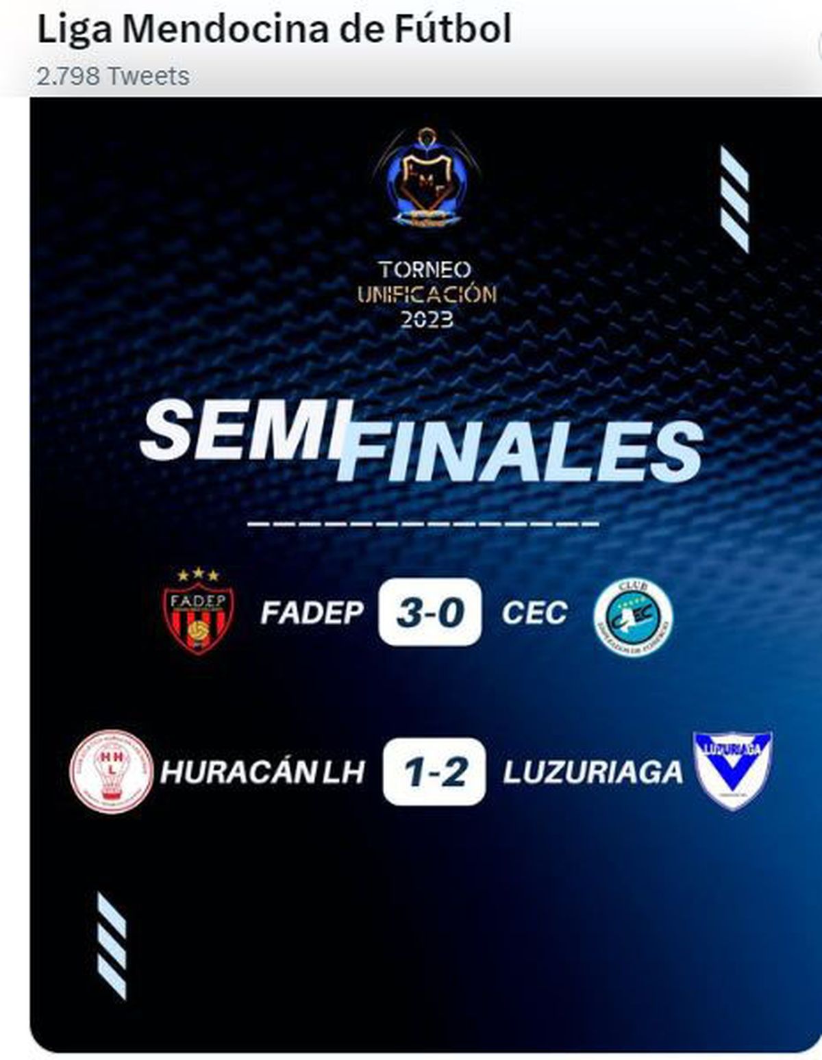 Deportivo Luzuriaga y FADEP accedieron este lunes a la final del torneo Unificación 2023 de la Liga Mendocina, tras ganarle a Huracán Las Heras y el CEC, respectivamente en las semifinales que se disputaron este lunes. El próximo domingo jugarán la final en estadio neutral.