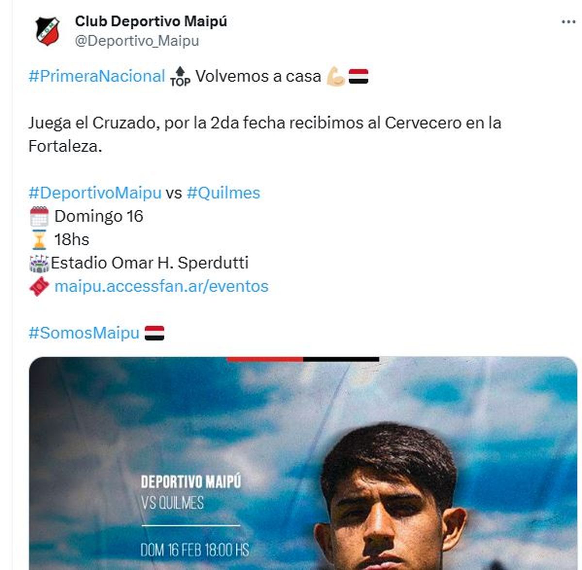 Deportivo Maipú tras jugará este domingo 16 de febrero a las 18 por la segunda fecha frente a Quilmes en el estadio Omar Higinio Sperdutti. En la tercera fecha se medirá el sábado 22 de febrero desde las 17 ante San Miguel, como visitante, y por la 4ta fecha se enfrentará el domingo 2 de marzo a las 18 ante Almagro, en calle Vergara.