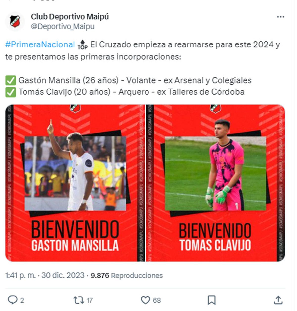 Además se sumarán al Cruzado el volante de 26 años Gastón Mansilla (ex Arsenal y Colegiales) y el ex arquero de Talleres de Córdoba Tomás Clavijo (20).