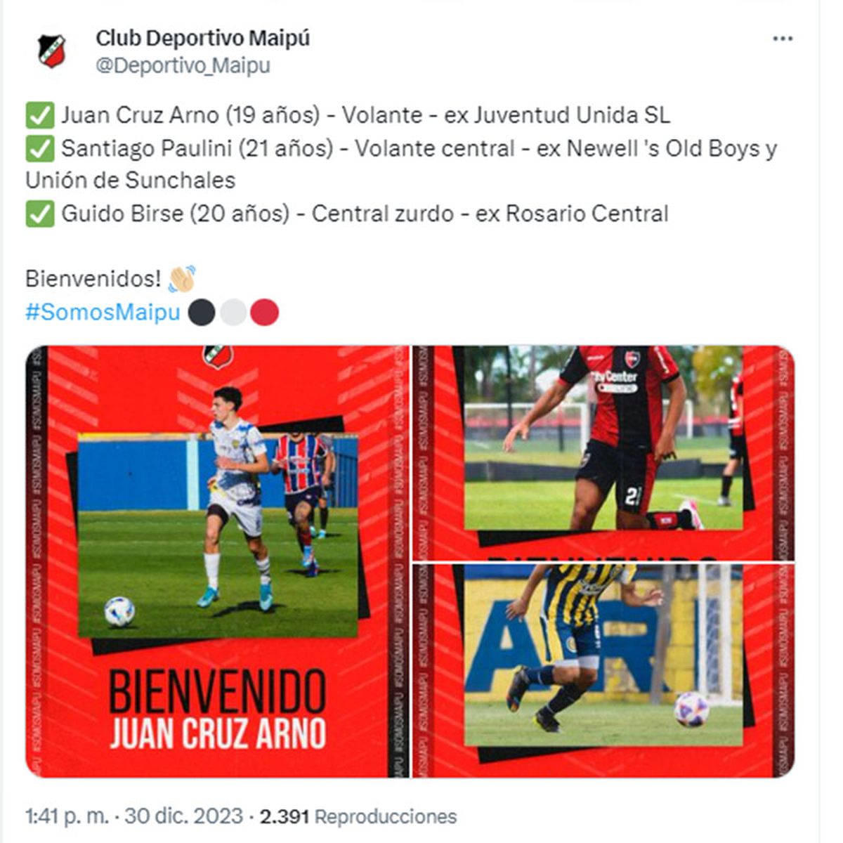 También Maipú incorporó a los volantes Juan Cruz Arno (19) -ex Juventud Unida de San Luis- y Santiago Paulini (21) -ex Newell's y Unión de Sunchales- y al marcador central Guido Birse (20) -ex Rosario Central-.