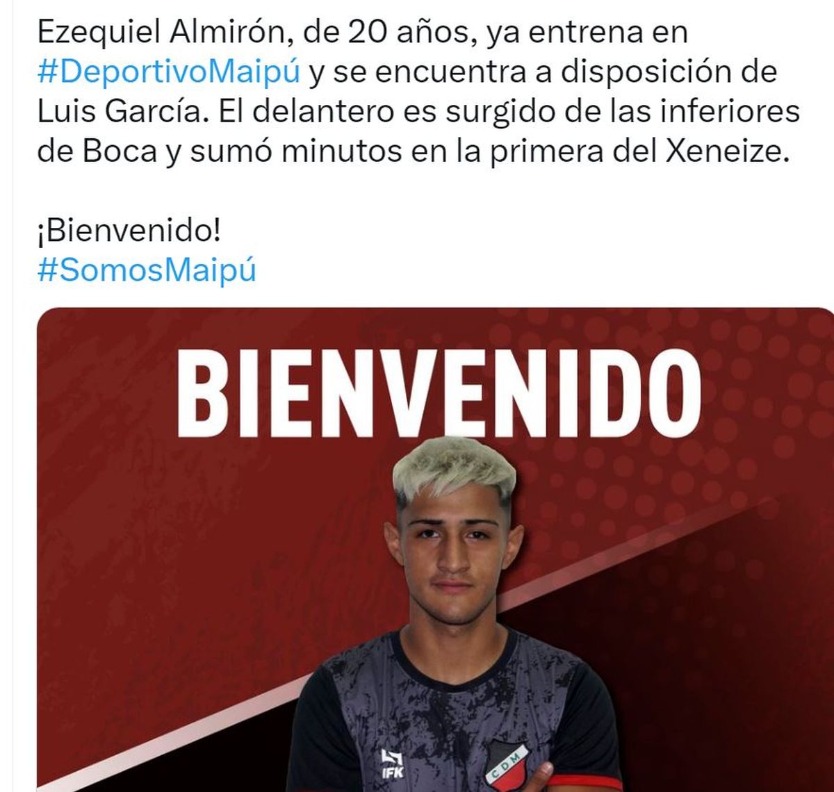 El delantero Ezequiel Almirón, de 20 años, ya se entrena como uno de los refuerzos del Deportivo Maipú para la temporada 2023 de la Primera Nacional.