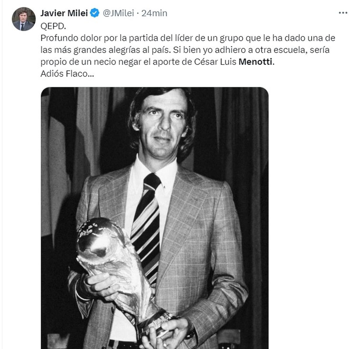 Hasta el presidente Javier Milei reconoció "yo adhiero a otra escuela" en su mensaje de despedida para el "Flaco", quien tiene también entre sus logros ser campeón del mundo con la Selección Nacional juvenil en Japón en 1979, en un equipo que tenía a jugadores como Diego Maradona, Ramón Díaz, Juan Simón, Juan Barbas, entre otros.
