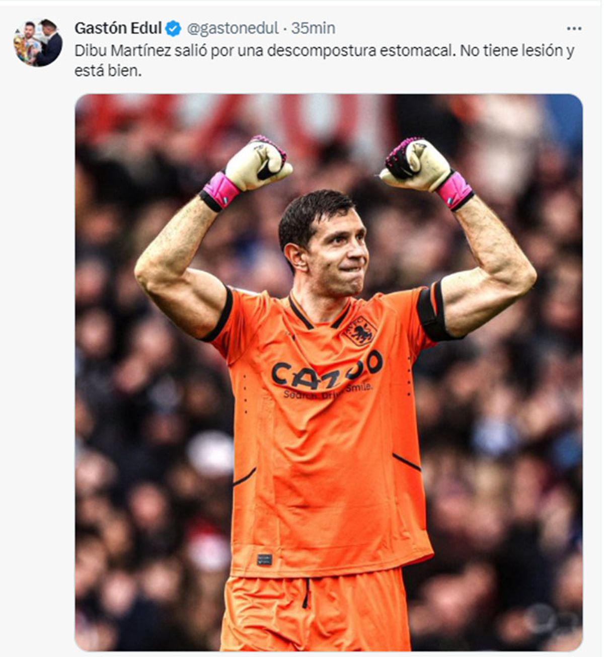 El Aston Villa aún no emitió ningún parte médico oficial sobre la molestia que obligó a Dibu Martínez a abandonar el campo de juego, aunque se estima que no se trata de un problema grave y que la decisión de Unai Emery de quitarlo fue por precaución.