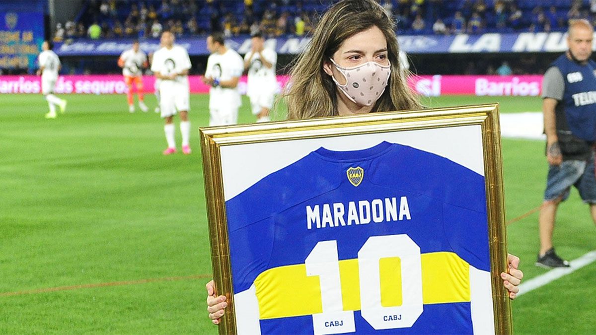 El capitán auriazul, Carlos Izquierdoz, recibió en el campo de juego a la hija del Diez, Dalma, le dio una plaqueta y una camiseta de Boca enmarcada con el nombre de Diego. El exrepresentante del Diez, Guillermo Cóppola, también estuvo en la cancha.