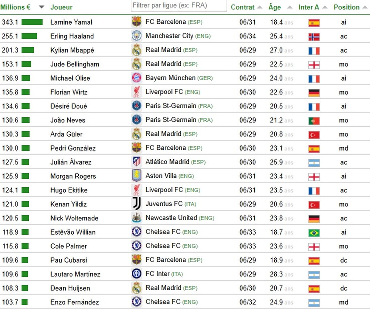 El Observatorio del Fútbol CIES elaboró el ranking con los 100 jugadores más caros del mundo. No hay argentinos en el top ten y la tabla la lidera Lamine Yamal