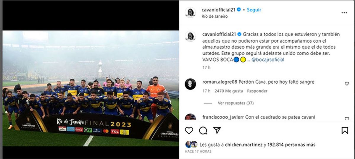 "Gracias a todos los que estuvieron y también a aquellos que no pudieron estar por acompañarnos con el alma, nuestro deseo más grande era el mismo que el de todos ustedes. Este grupo seguirá adelante unido como debe ser. VAMOS BOCA", escribió Cavani en sus cuentas oficiales de las diferentes redes sociales.