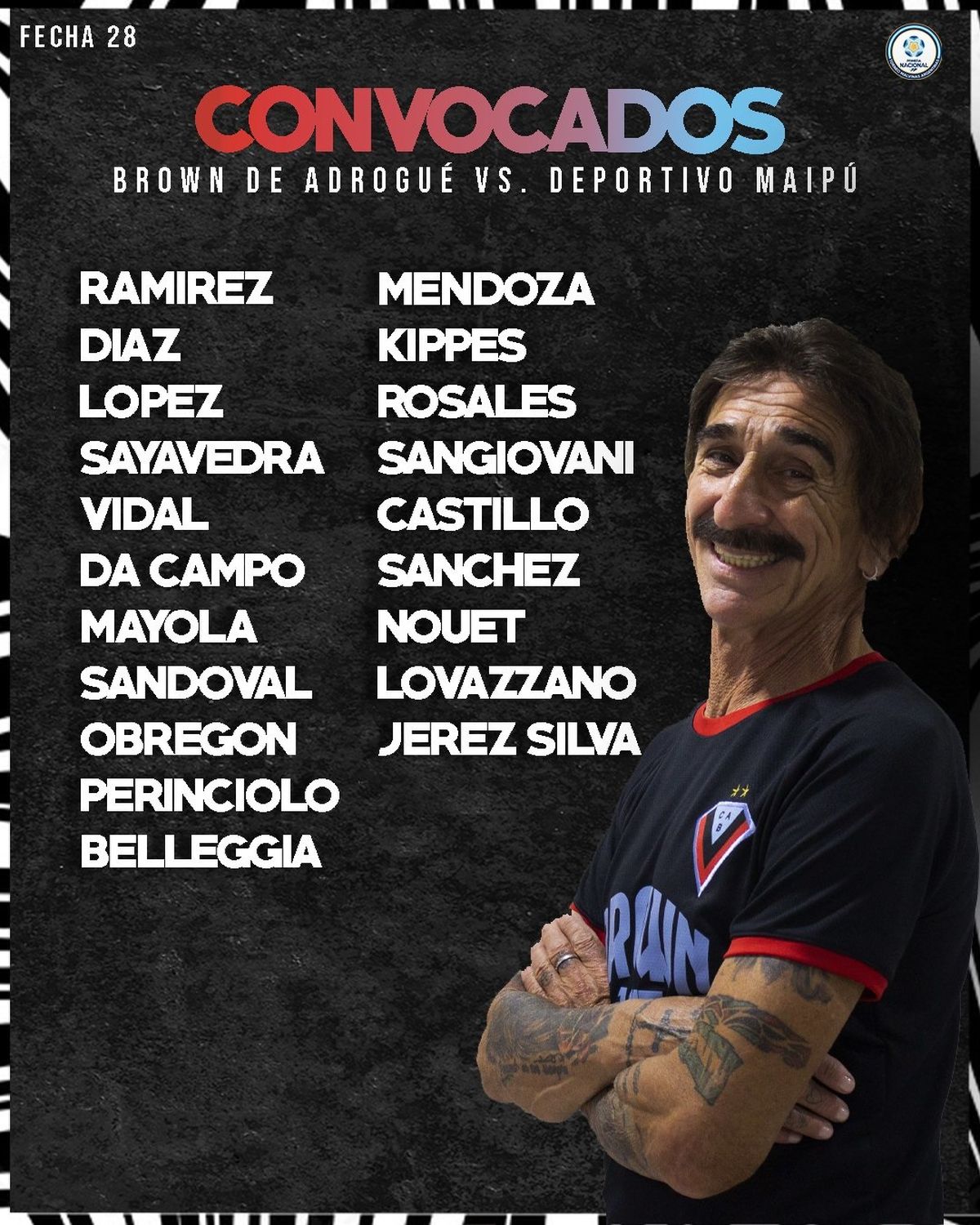 Brown: Horacio Ramírez; Mauricio Rosales, Ariel Kippes, Tomás López y Ayrton Sánchez; Lautaro Lovazzano, Hernán Da Campo, Lautaro Bellegia y Franco Perinciolo; Agustín Lavezzi y Juan Mendoza. DT: Pablo Vicó.