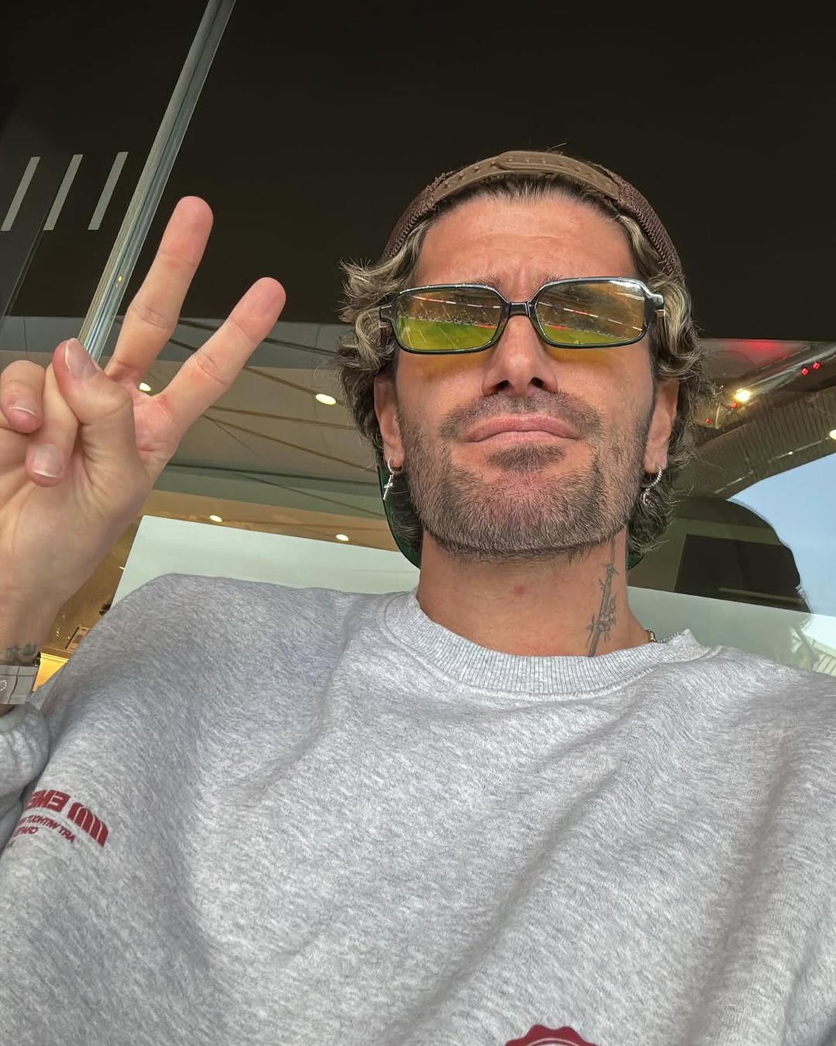 Fiel a su estilo, Rodrigo De Paul se mostró con un llamativo look: ropa oversize, pantalones holgados, lentes de sol y gorra. Además, se mostró tomando café desde uno de los palcos del estadio.