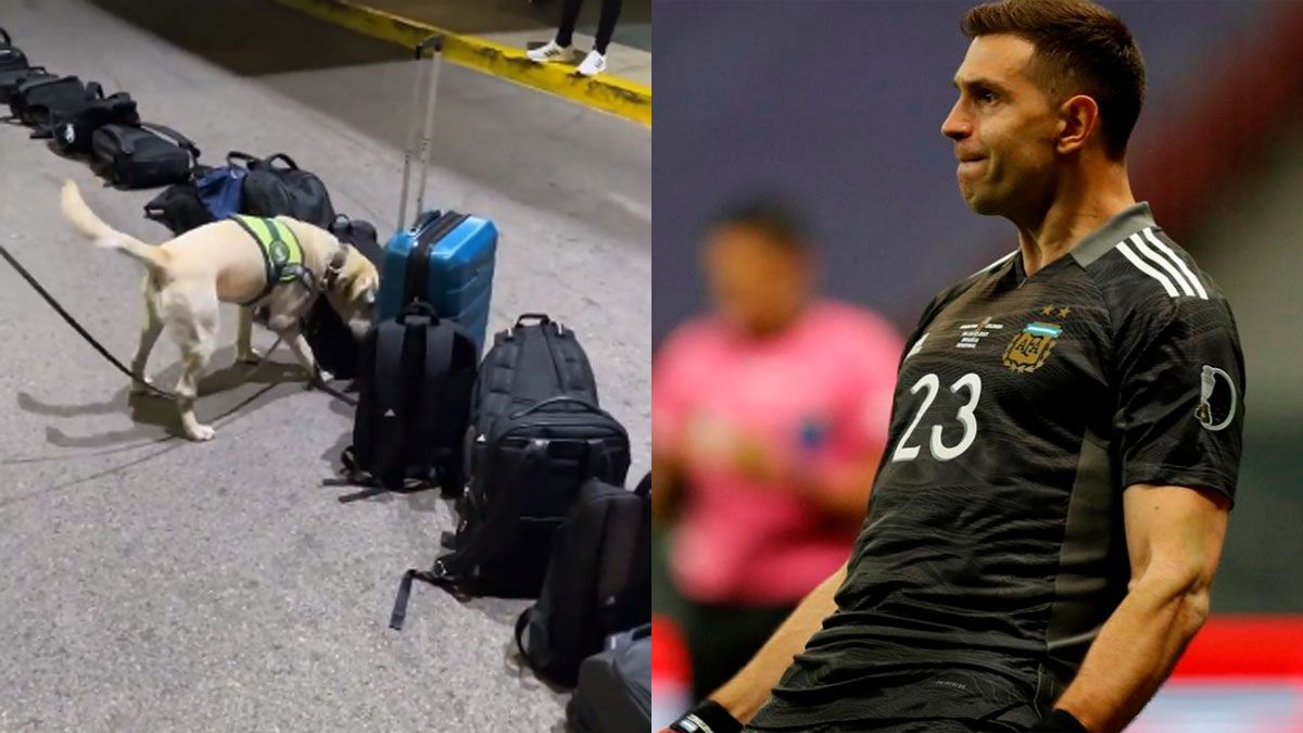 Dibu Martínez se burló con una historia en Instagram del procedimiento llevado a cabo por un efectivo de la policía aeronáutica y un perro entrenado sobre el equipaje de mano de los futbolistas: "¡Uh, encontró un (caramelo) sugus!", expresó mientras el animal olfateaba los bolsos.