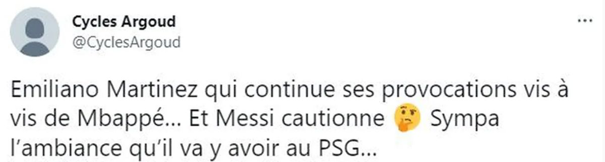 Otra de las quejas hacia el Dibu Martínez, aseguró: “Emiliano Martínez que sigue con sus provocaciones contra Mbappé... Y Messi lo refrenda. Buen ambiente habrá en el PSG...”.