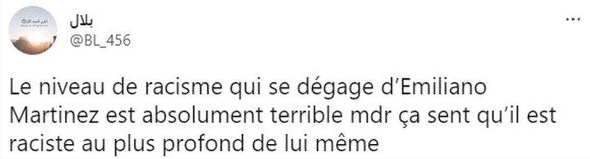 “El nivel de racismo que emerge de Emiliano Martinez es absolutamente terrible”, posteó otro enojado hincha de Francia.