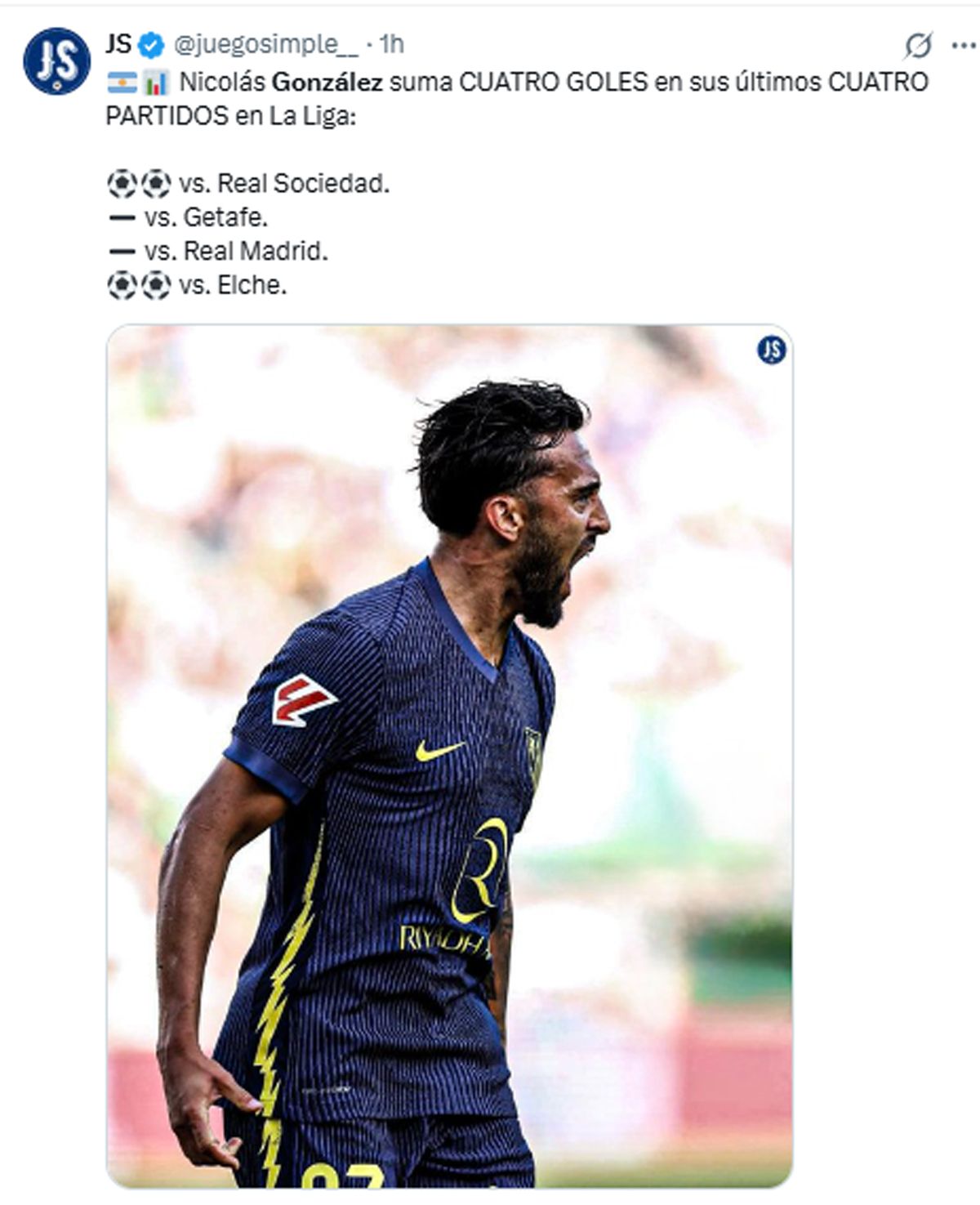 Nicolás González, cuyo nivel es una alegría para Lionel Scaloni pensando en el Mundial, fue la figura ya que abrió el marcador y volvió a aparecer para poner el 2-2 parcial con un cabezazo a quemarropa. Sin embargo, el partido se complicó para el Atlético cuando Thiago Almada, otro que fue titular, vio la tarjeta roja directa por una falta que derivó en penal y gol del portugués André Silva.