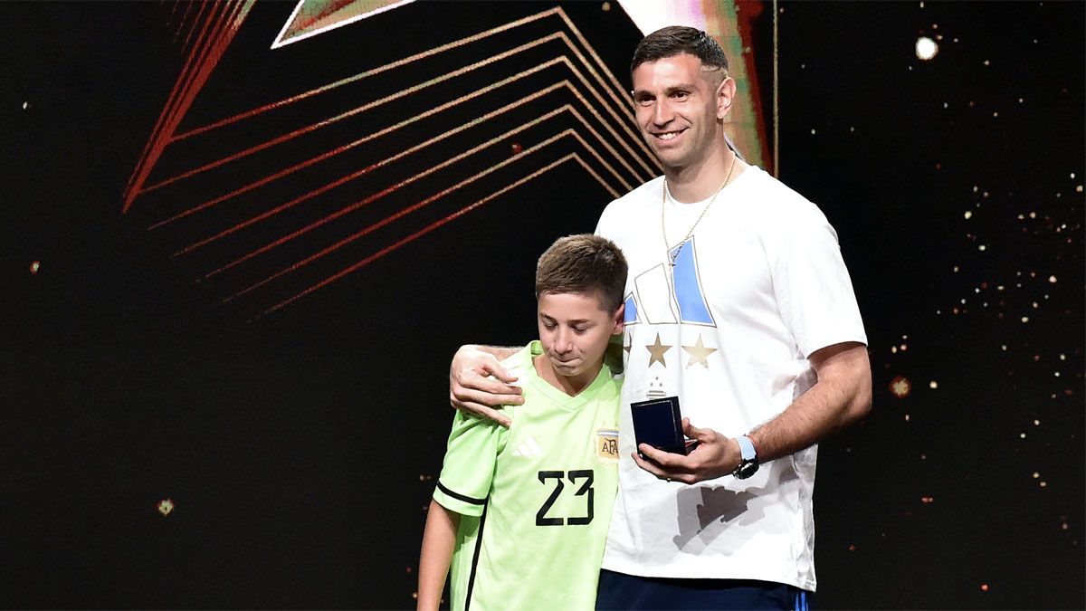 Después, Domínguez volvió a subir al estrado junto al jugador del Paris Saint Germain (PSG) al cual le entregó la réplica de las tres copas que obtuvo la "Scaloneta" y le comentó, entre risas: "La que te falta es la Libertadores".