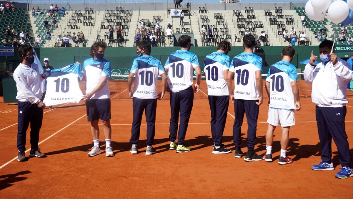 El astro Diego Armando Maradona, fallecido en noviembre del año pasado a los 60 años, recibió este sábado un sentido homenaje del equipo de Copa Davis de la Argentina previo al inicio de la serie ante Bielorrusia en el Buenos Aires Lawn Tennis Club.