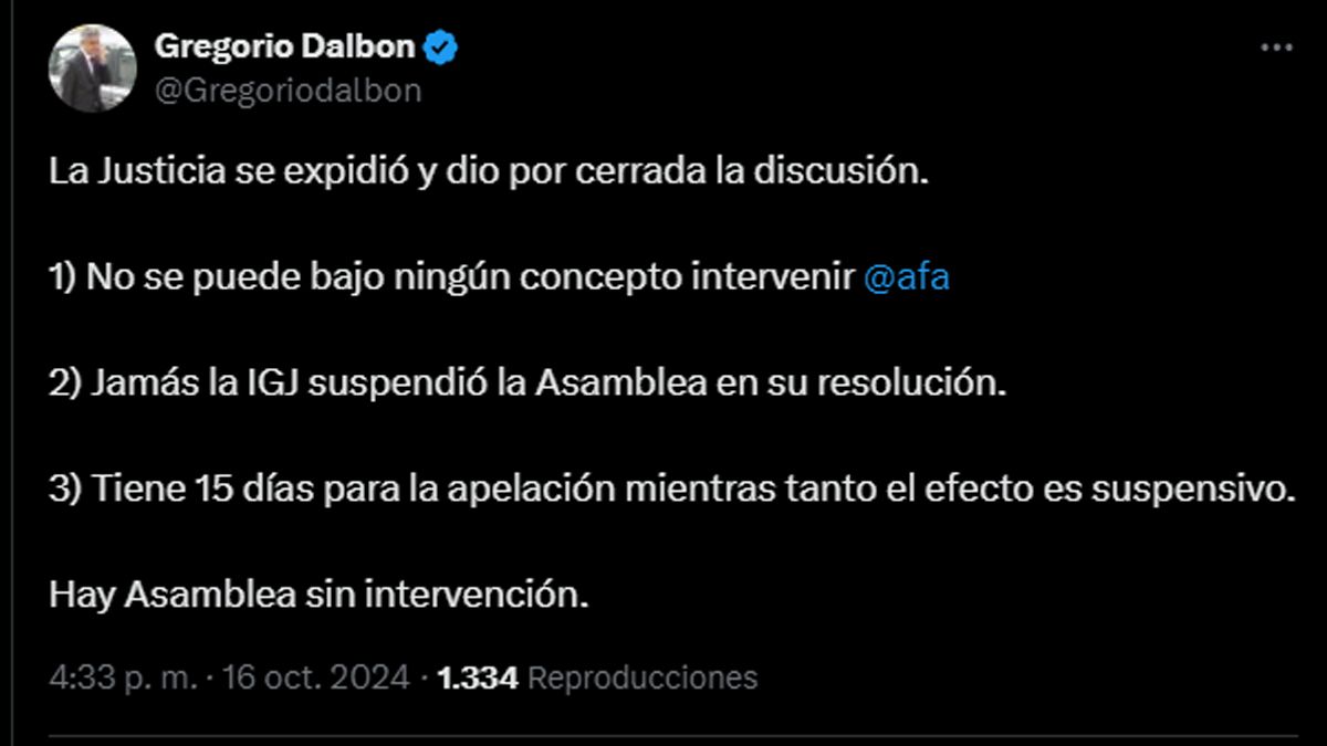 "Bueno tema terminado. Espero que Javier Milei y Mauricio Macri sepan respetar la Justicia. Fassi e IGJ solo son mandatarios del Poder de las SAD. #NoPasarán" (Gregorio Dalbón)