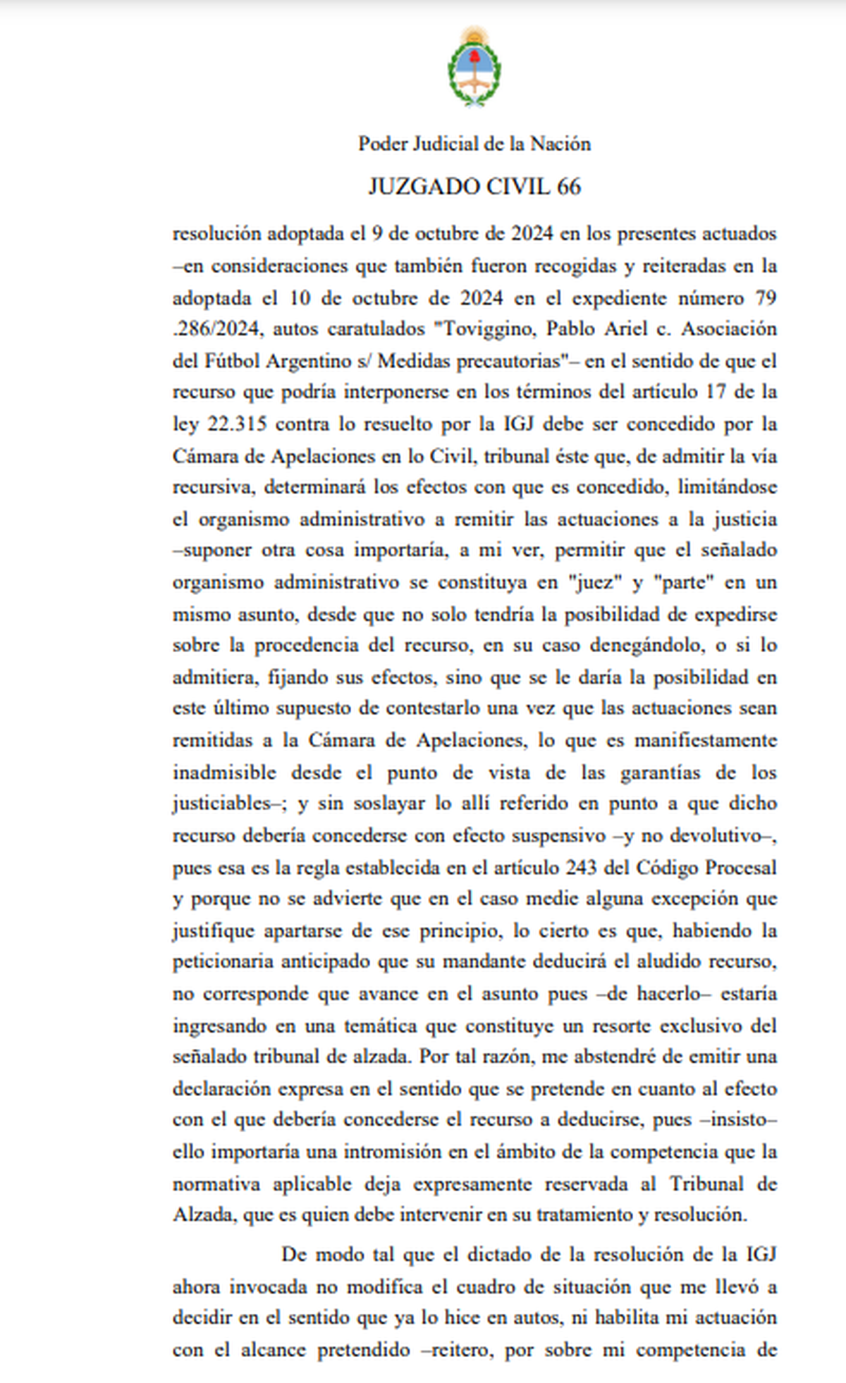 El juzgado Civil 66 determinó que aún están vigentes los plazos para que AFA apele y advirtió al organismo que tiene que remitir la decisión a la Justicia porque sino “se estaría convirtiéndo en juez y parte”.