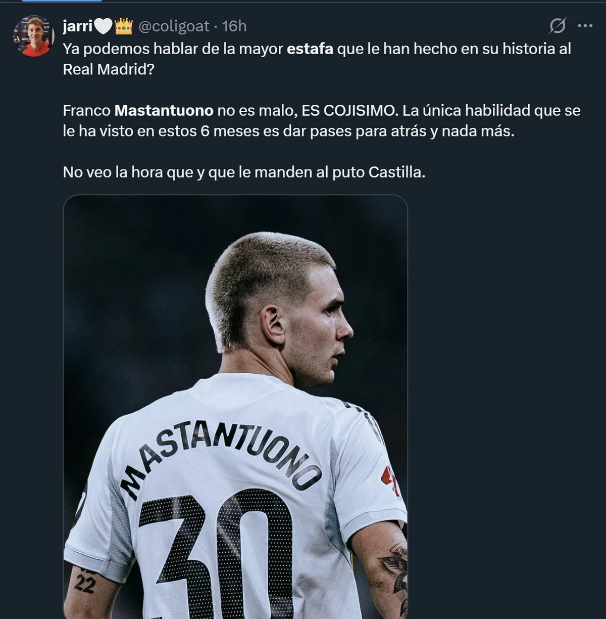 Ahora, Alonso ya no continuará al mando del plantel de la capital española, su lugar lo ocupará de momento Álvaro Arbeloa, y el futuro de Mastantuono es una incógnita ya que podría no ser del agrado del próximo entrenador.