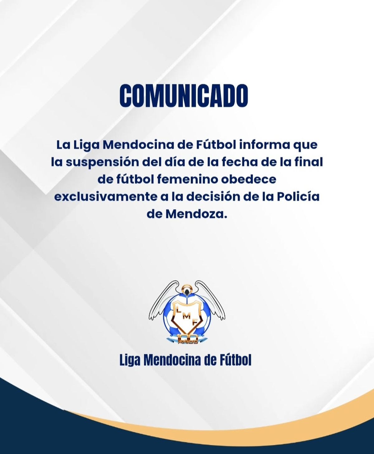 Responsabilizamos a la Liga Mendocina de Fútbol por el nuevo fracaso en la organización de la final del Torneo Clausura femenino. El operativo de seguridad dispuesto por el Ministerio de Seguridad y Justicia fue correcto y se desarrolló conforme a lo planificado.