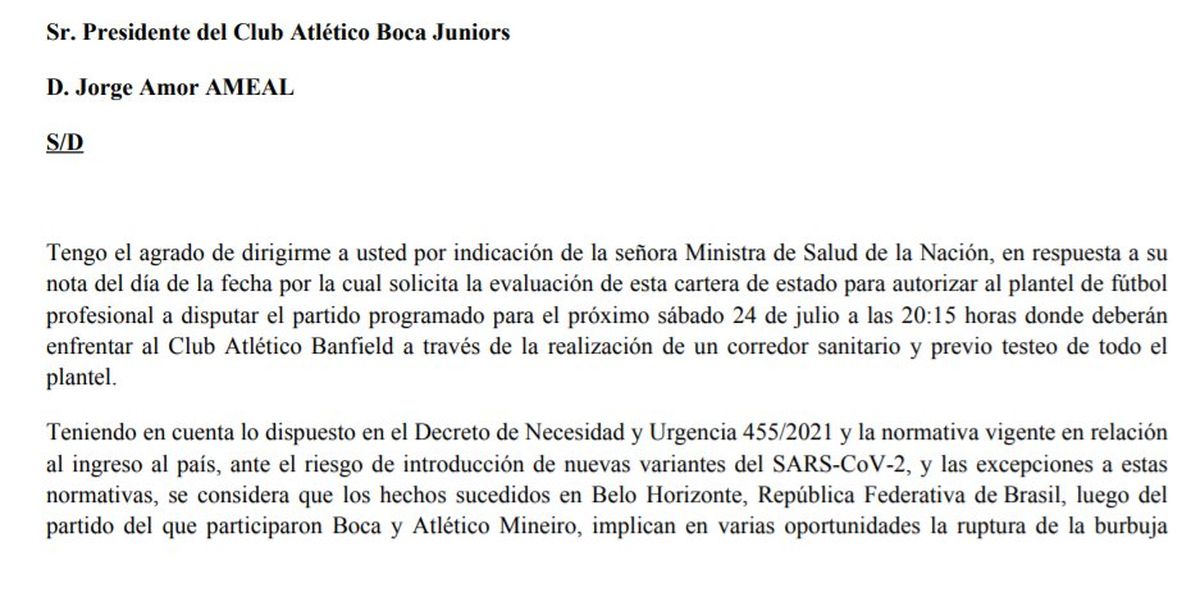 El Gobierno desestimó el pedido formal de Boca de utilizar un corredor sanitario en el marco de la pandemia de Covid y así afrontar con el equipo titular el partido ante Banfield, este sábado a las 20.15 por la segunda fecha de la Liga Profesional de Fútbol (LPF).